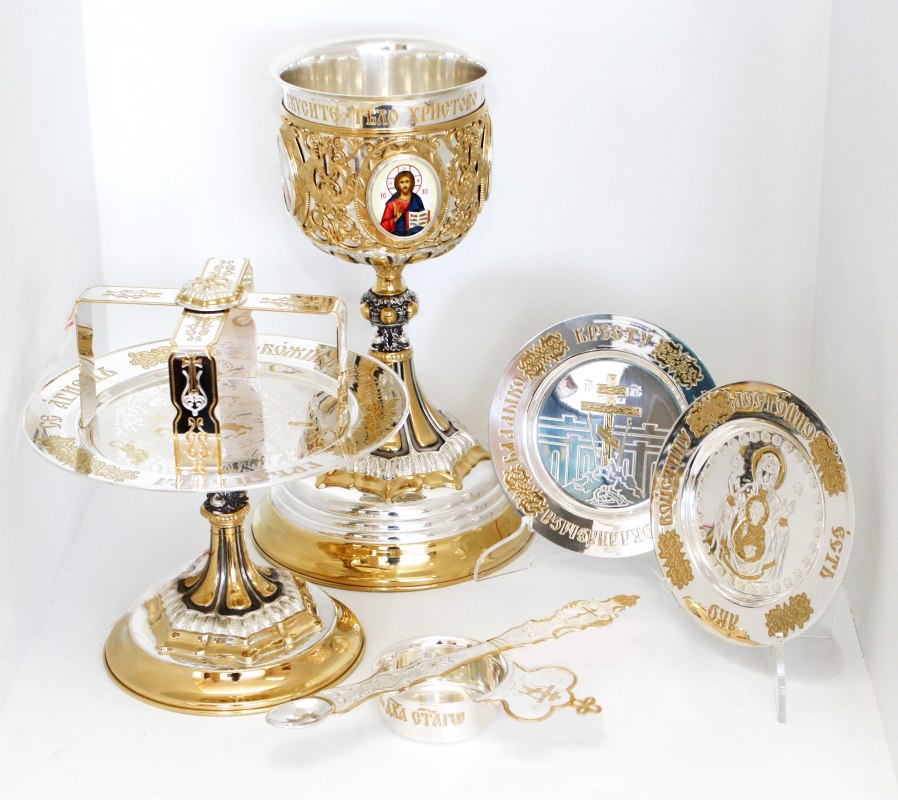 - Евхаристический набор комбинированный с чашей 1 л, в фрагментарной позолоте и патинированием на 7 предметов 2.7.0980клфр-18-К/7