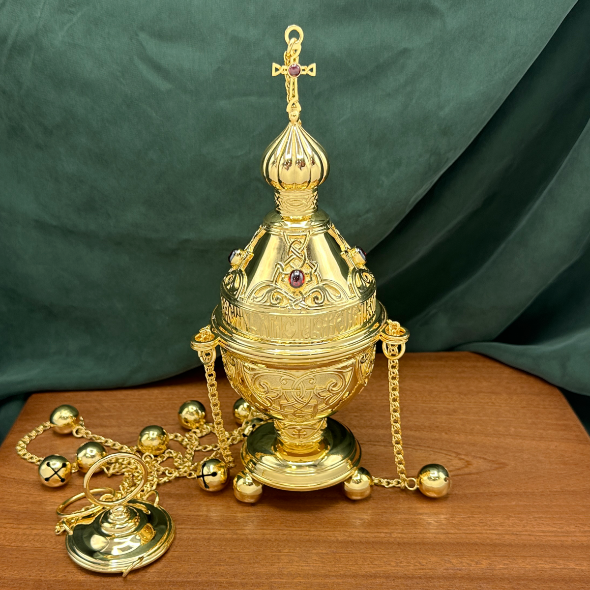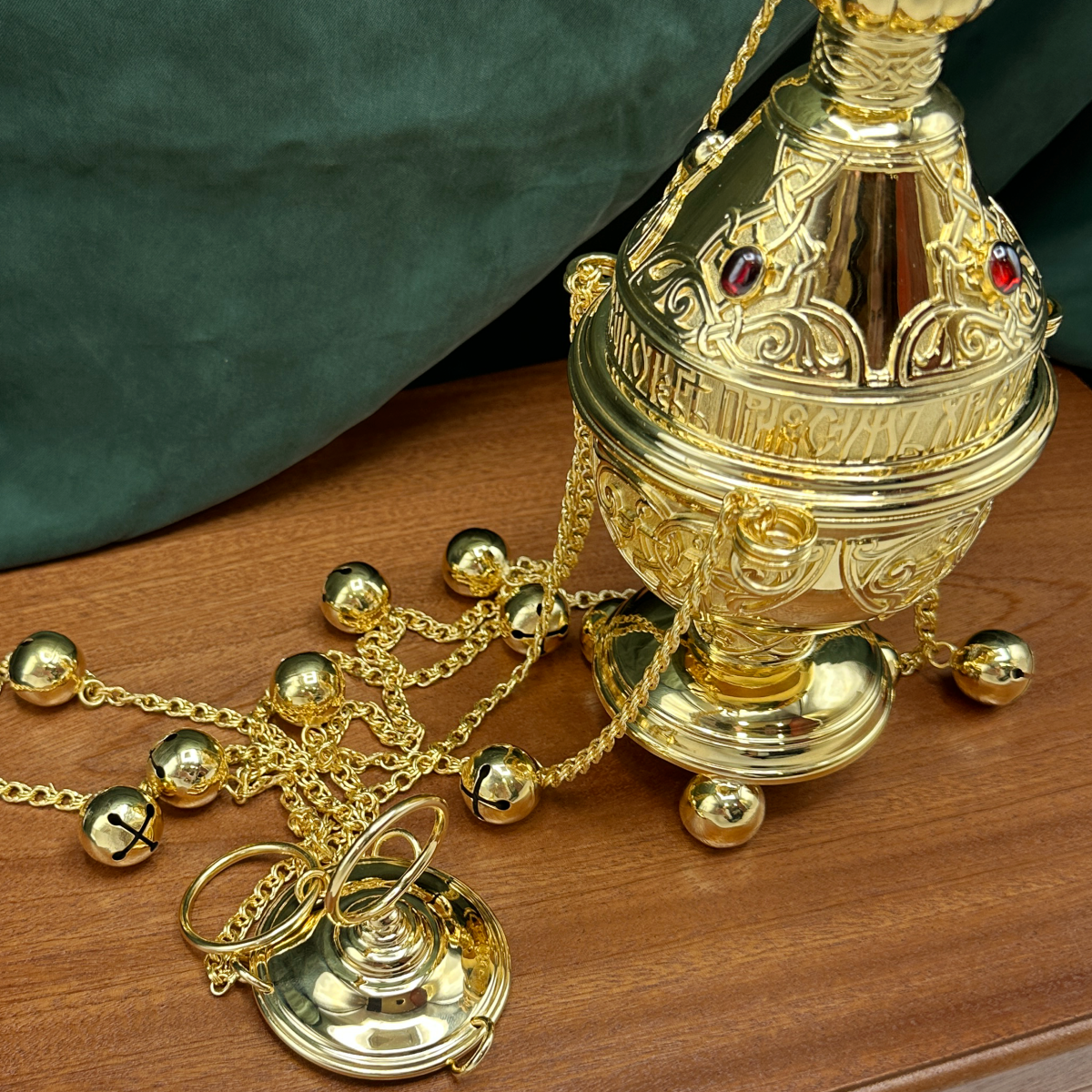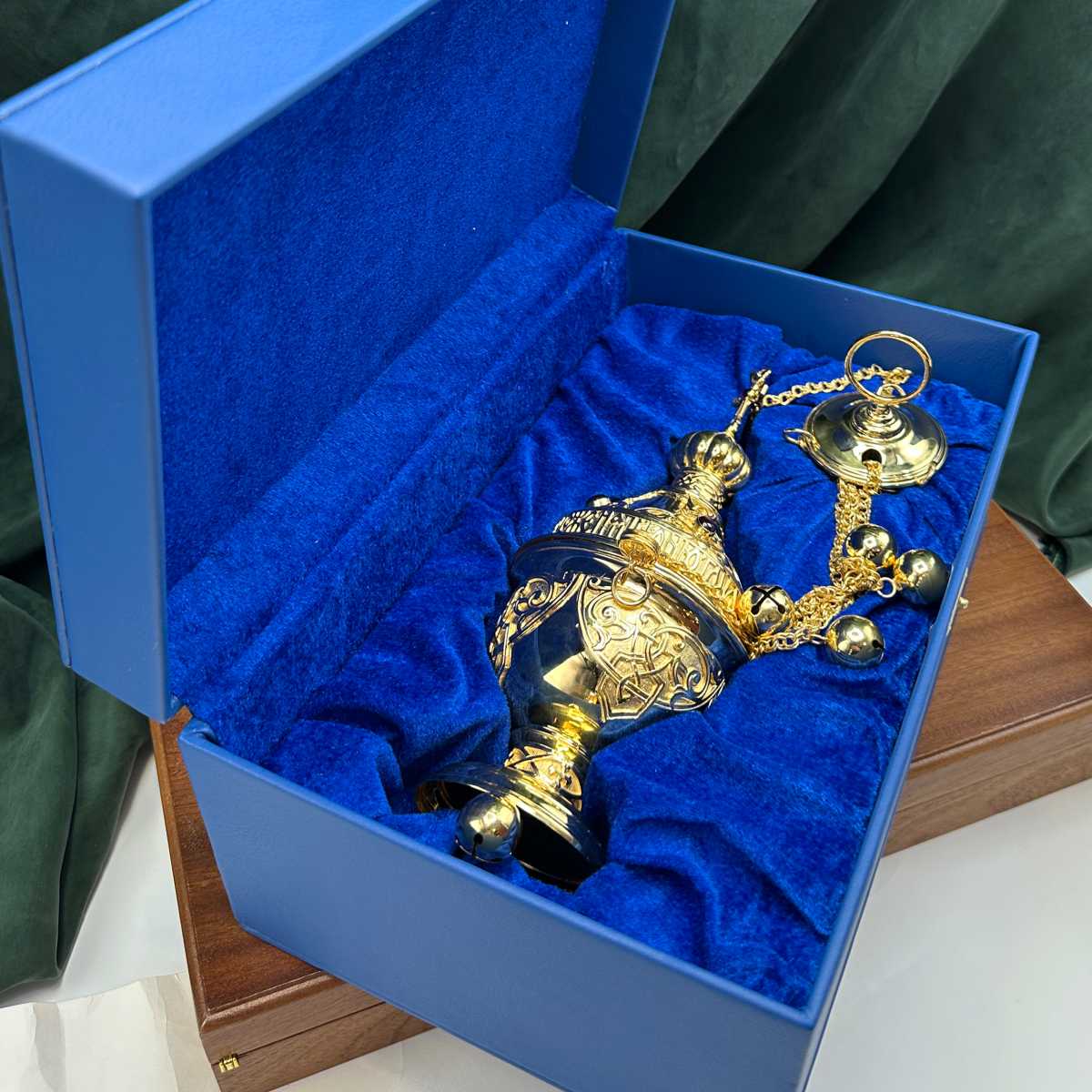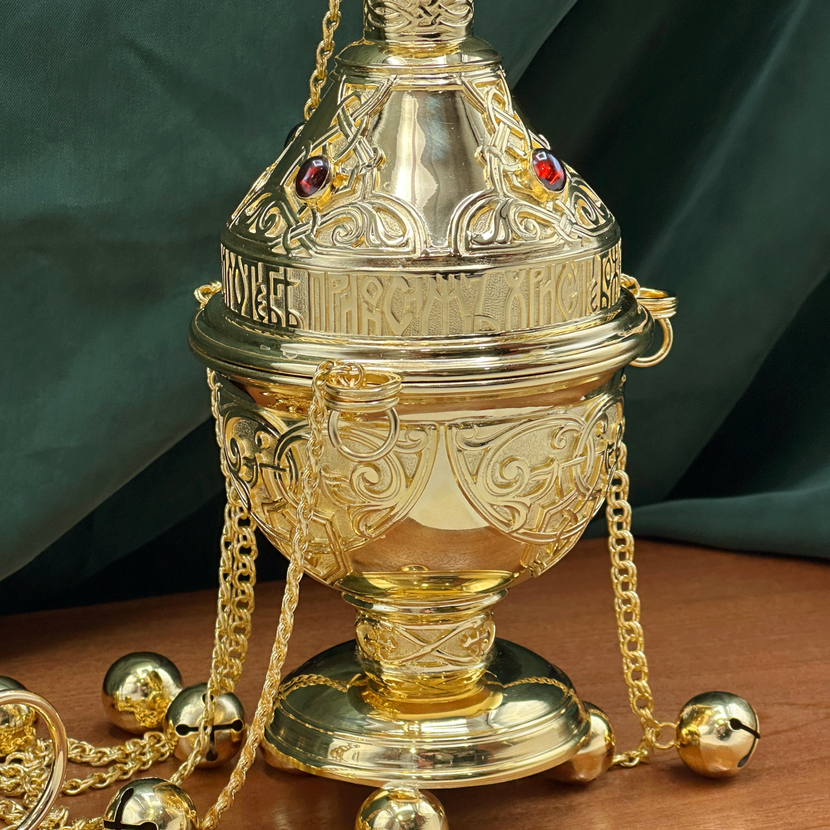 Кадило изготовлено из высококачественного ювелирного сплава, специально созданного для производства ювелирных изделий и покрыто надёжной позолотой при помощи специальной технологии — гальваники. Благодаря этому за изделием просто ухаживать: чтобы вернуть кадилу первоначальный блеск, достаточно просто протереть его сухой мягкой тканью.  Кадило украшено фианитами. Плетение цепи — ручное, поэтому цепь надёжна и не будет требовать ремонта. Ёмкость для угля глубокая, что исключит выпадение угля во время каждения. У кадила бубенцы с мягким мелодичным звоном. Изделие продаётся в презентабельной подарочной упаковке из экокожи с бархатным ложементом.