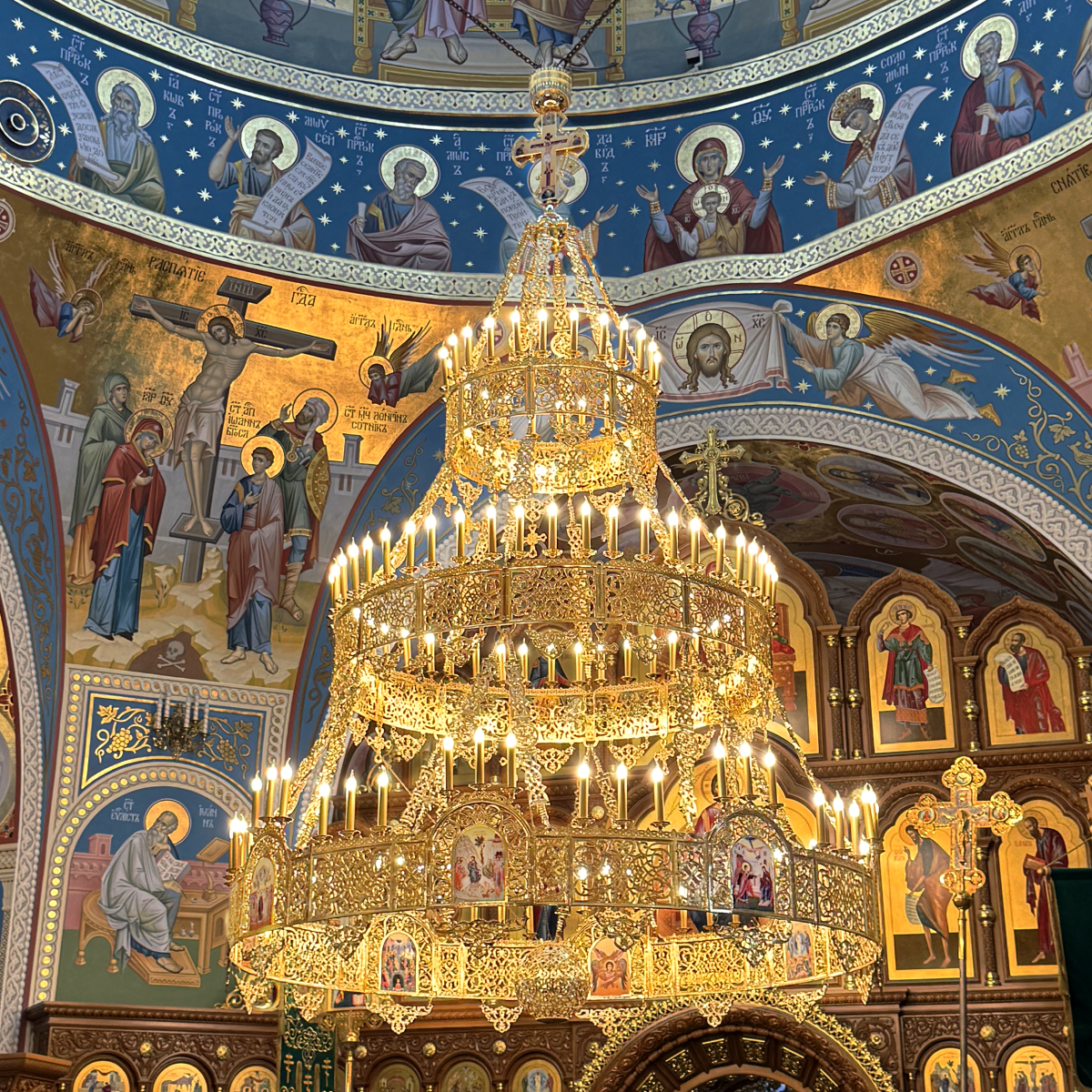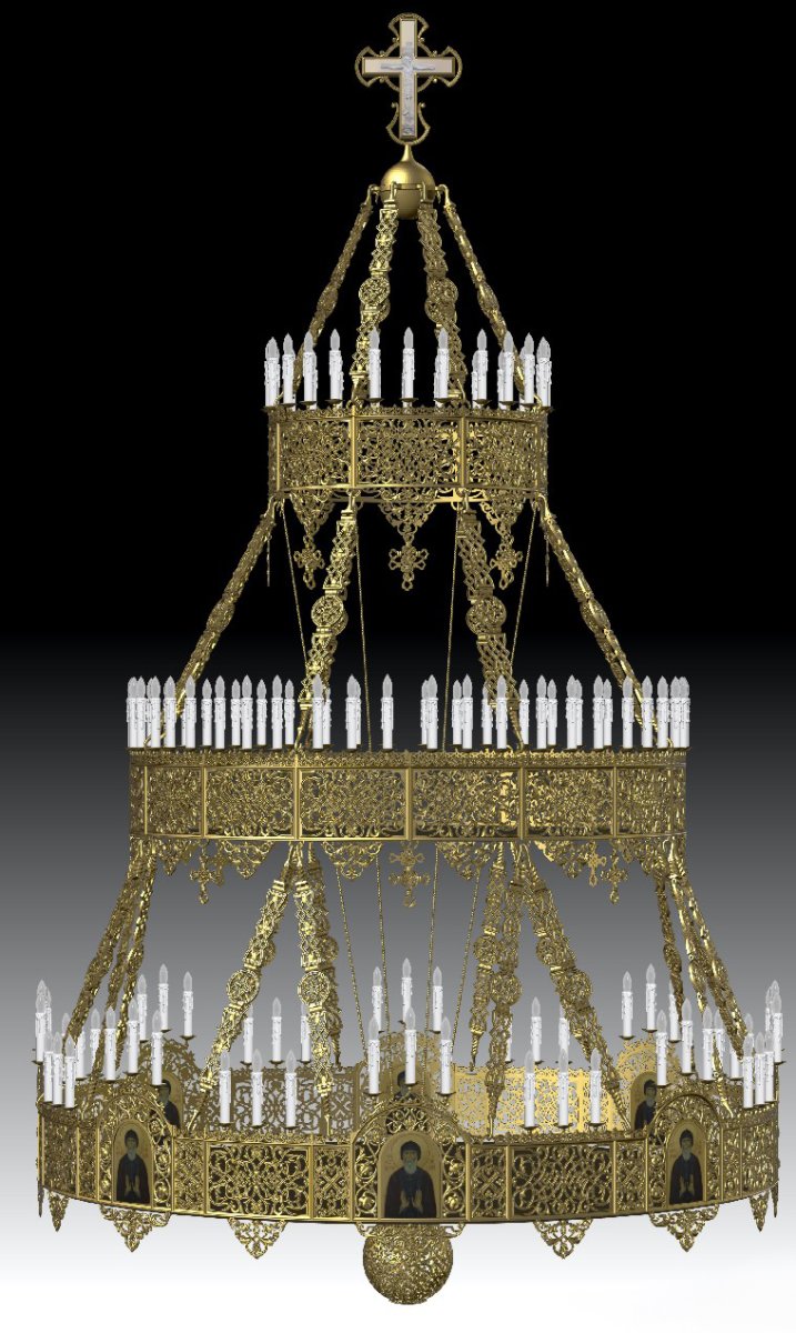 Данный хорос оснащён 120 свечами по диаметру каждого яруса. Для изготовления данного хороса используется латунь и алюминий, сверху изделие покрыто металлизацией. Состоит из 3 колец: нижнее кольцо - 276 см, среднее кольцо - 200см, верхнее кольцо - 100 см.