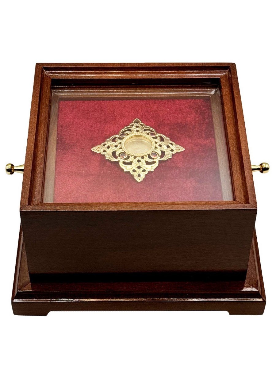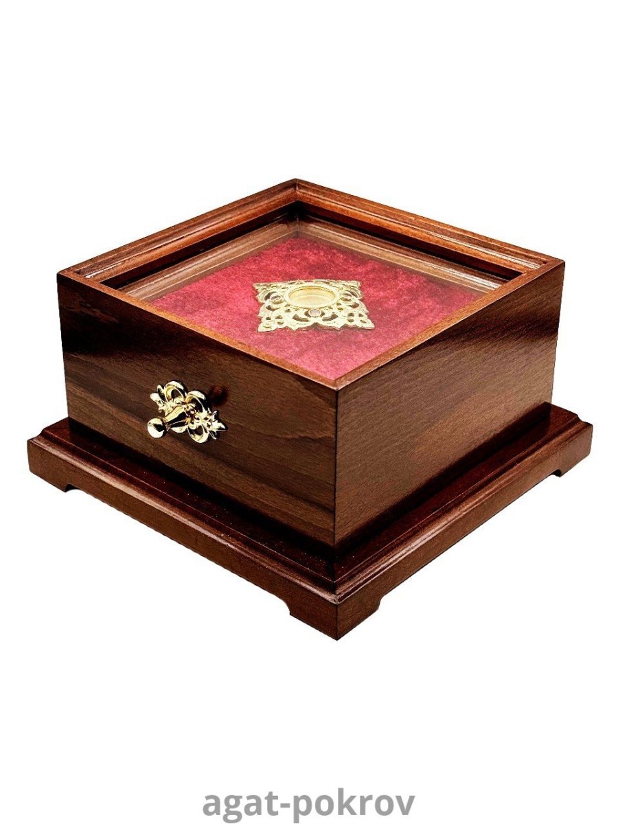 Ковчег для мощей изготовлен из дерева. Мощевик изготовлен из ювелирного сплава, покрытого позолотой гальваническим методом, такое покрытие продлевает срок службы изделия, защищает от внешних неблагоприятных воздействий.