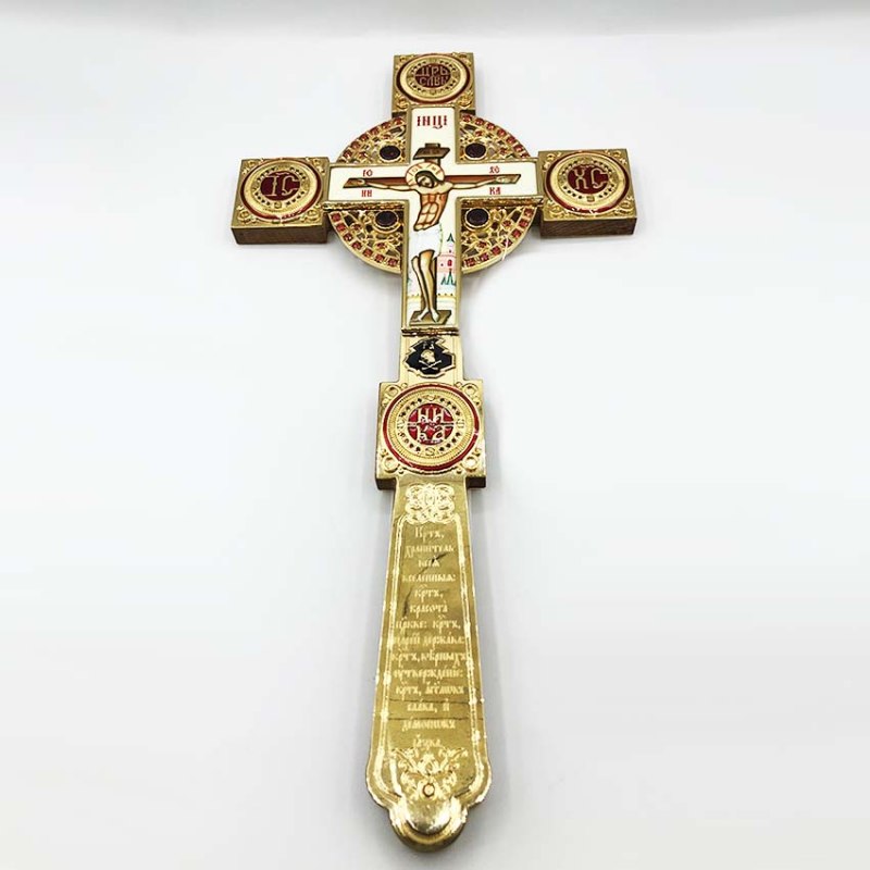 Среднего размера напрестольный крест оригинального дизайна. Внутренняя часть креста изготовлена из деревянного массива, покрытого лаком, а лицевая и оборотная сторона - из высококачественного ювелирного сплава, покрытого надежной позолотой. Благодаря такому исполнению, крест имеет небольшой вес, за ним просто ухаживать.Распятие выполнено при помощи специальной технологии нанесения цветного изображения на металлическую основу, оно покрыто защитным составом, предохраняющим его от выгорания цвета и повреждений. Крест декорирован вставками камней кубического циркония (фианиты) и эмалью. Изделие продается в презентабельной кожвиниловой упаковке с бархатным ложементом внутри.