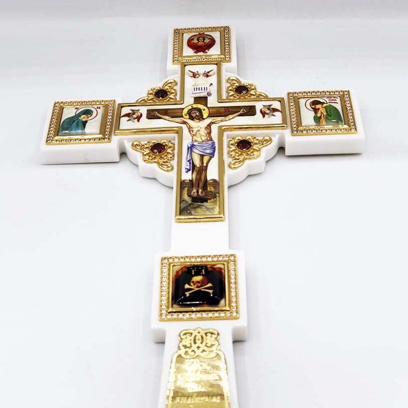 Крест Напрестольный латунный в позолоте, с латунным принтом на декоративном камне*в магазине Благолепие Богослужения