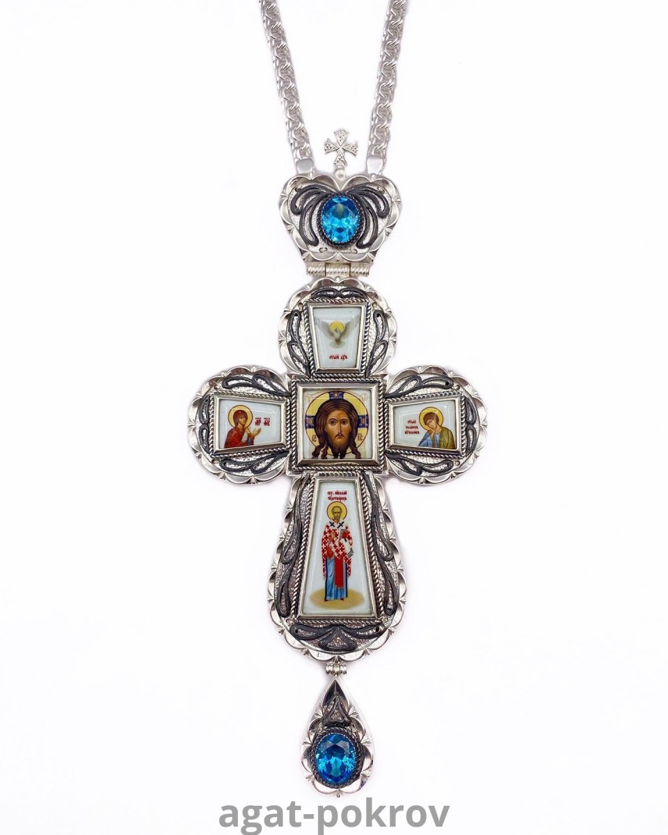 Крест изготовлен из высококачественного ювелирного сплава, покрытого серебрением гальваническим методом. Такое покрытие продлевает срок службы изделия, защищает от внешних неблагоприятных воздействий. Крест декорирован голубыми фианитами и чернением. Изделие продается в фирменной упаковке из экокожи с бархатным ложементом.
