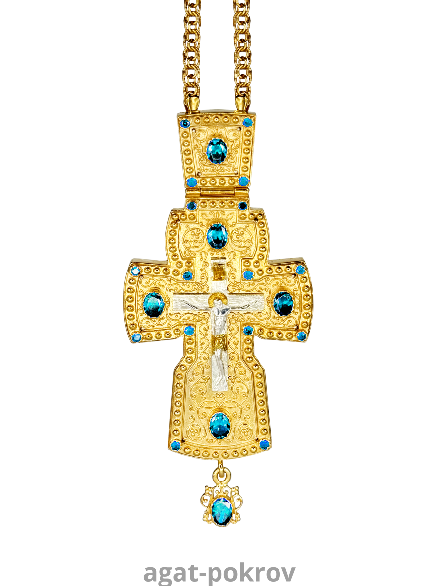 Наперсный крест изготовлен из латуни и покрыт позолотой, нанесенной гальваническим способом. Распятие литьевое, объемное, акцентировано фрагментарным серебрением. Крест покрыт мелким объемным декором и украшен вставками фианитов высокого качества. Камни закреплены вручную, что гарантирует их нахождение на своих местах на весь период ношения креста.