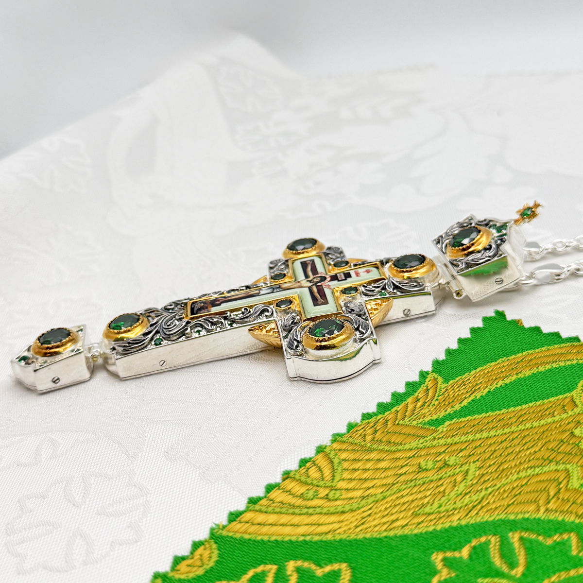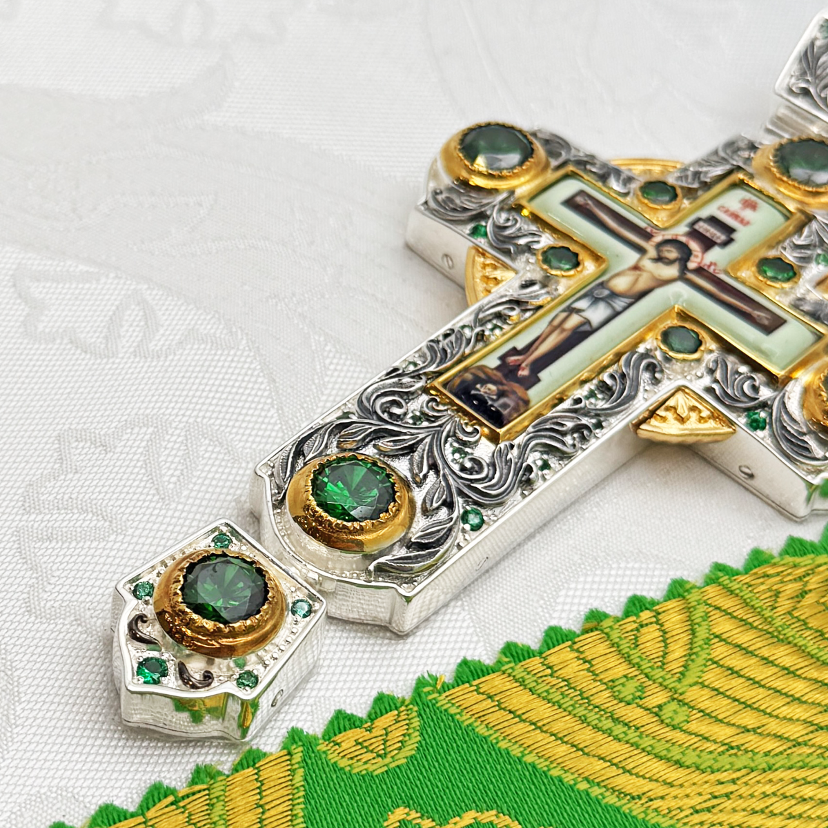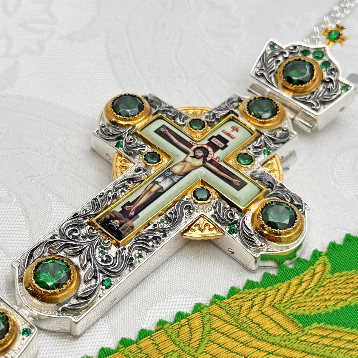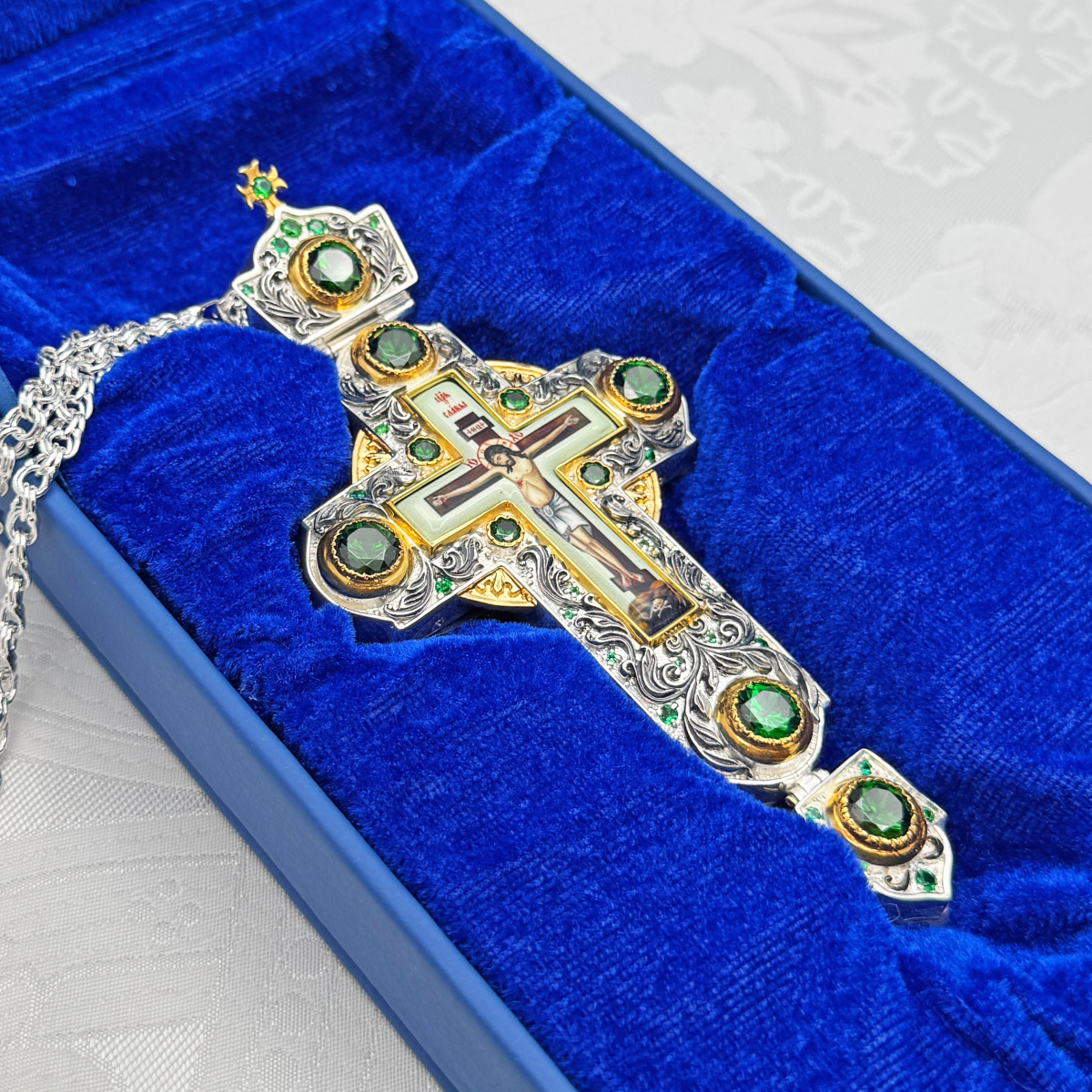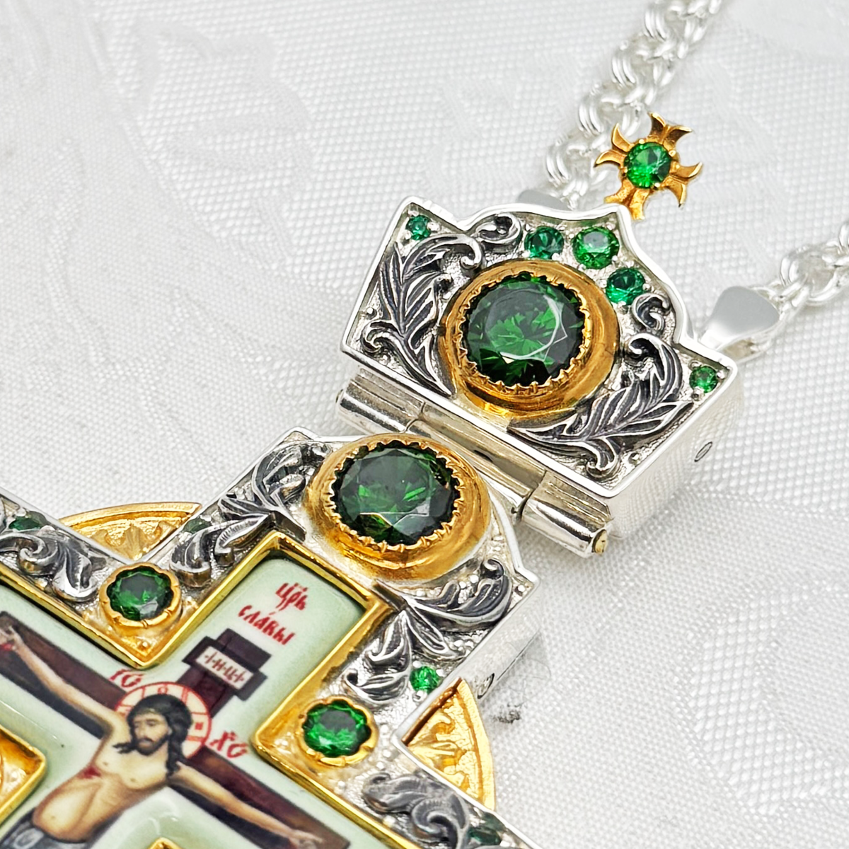 Крест наперсный изготовлен из высококачественного ювелирного сплава, покрытого позолотой гальваническим методом, такое покрытие продлевает срок службы изделия, защищает от внешних неблагоприятных воздействий. Изделие декорировано вставками из красных фианитов и объемными узорами, покрытыми серебрением. Крест продается в фирменной упаковке из экокожи с бархатным ложементом.