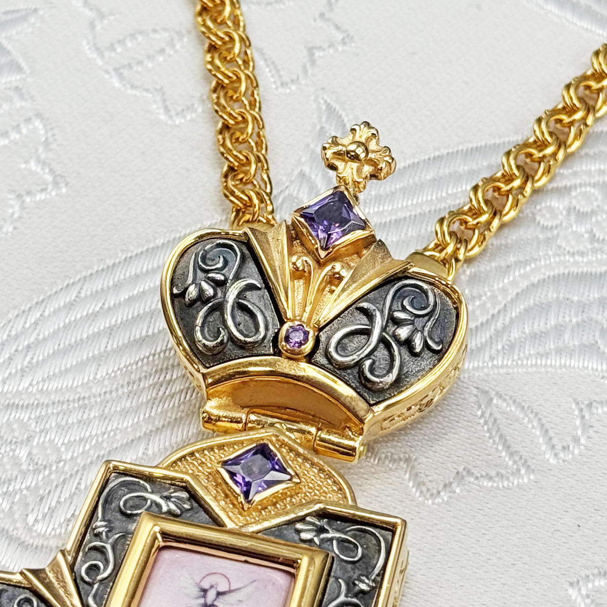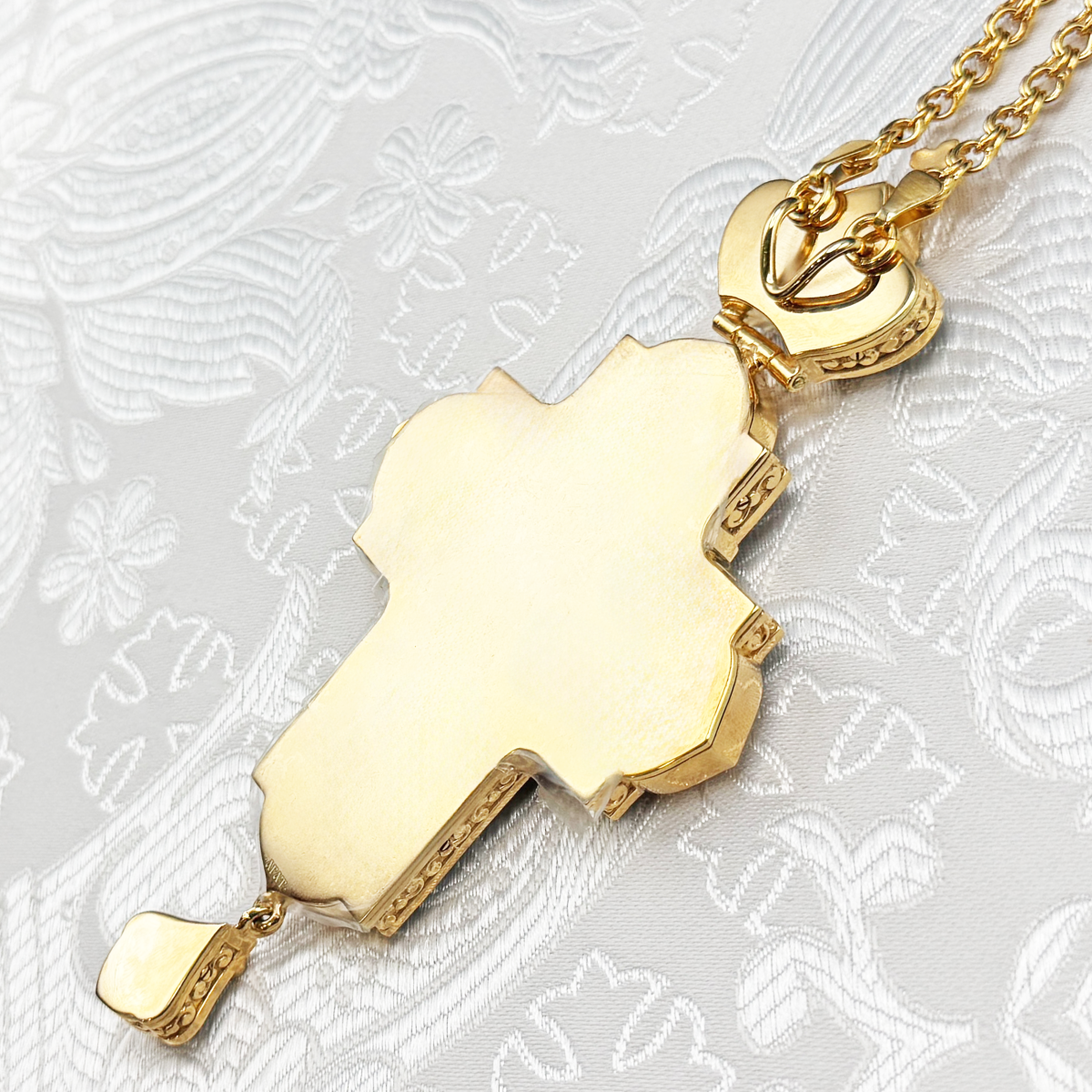 Крест наперсный с украшениями изготовлен из высококачественного ювелирного сплава, специально созданного для производства ювелирных изделий. Распятие креста, выполнено при помощи специальной технологии деколь. Крест покрыт качественной и надежной позолотой и патинированием, которая сохранит первоначальный внешний вид изделия. Крест в комплекте с цепью, продается в презентабельной кожвиниловой упаковке с бархатным ложементом.