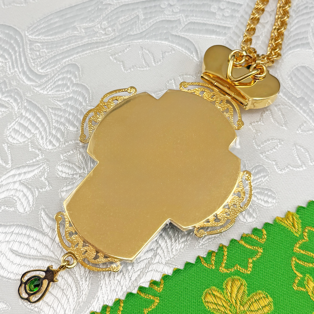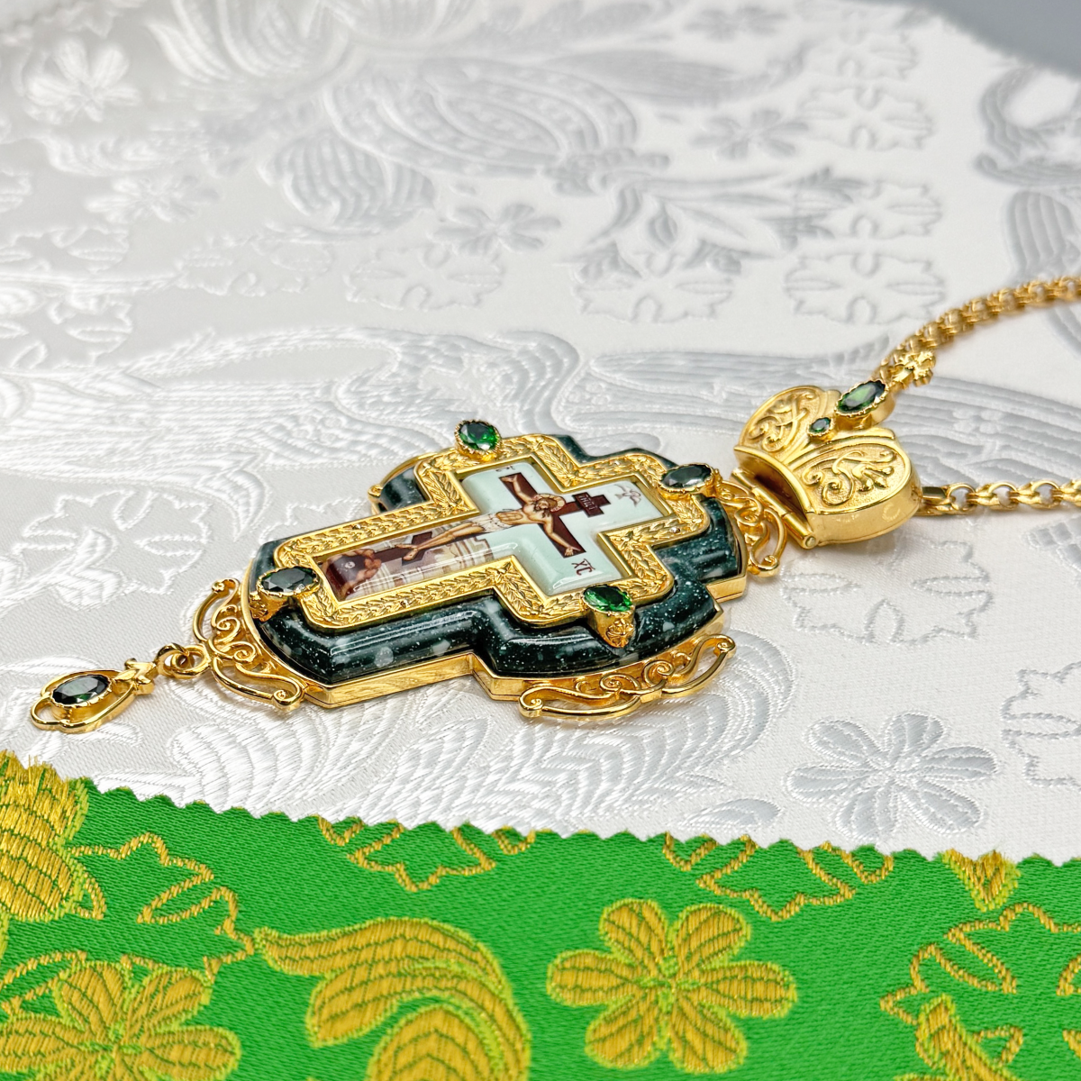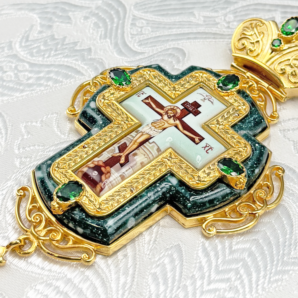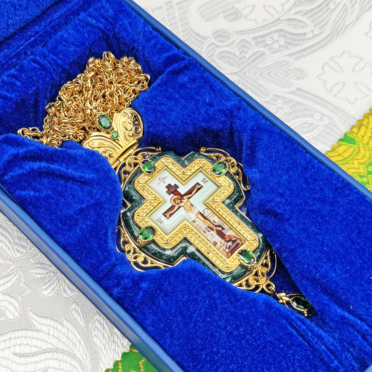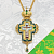 Наперсный крест изготовлен из высококачественного ювелирного сплава и позолочен гальваническим методом. Это продлевает срок службы изделия, защищает от внешних неблагоприятных воздействий. Распятие выполнено на металлической основе, покрыто специальным защитным слоем. Крест декорирован вставкой из акрила и фианитами. Продаётся в фирменной упаковке из экокожи с бархатным ложементом. На задней поверхности креста наклеена заводская плёнка.