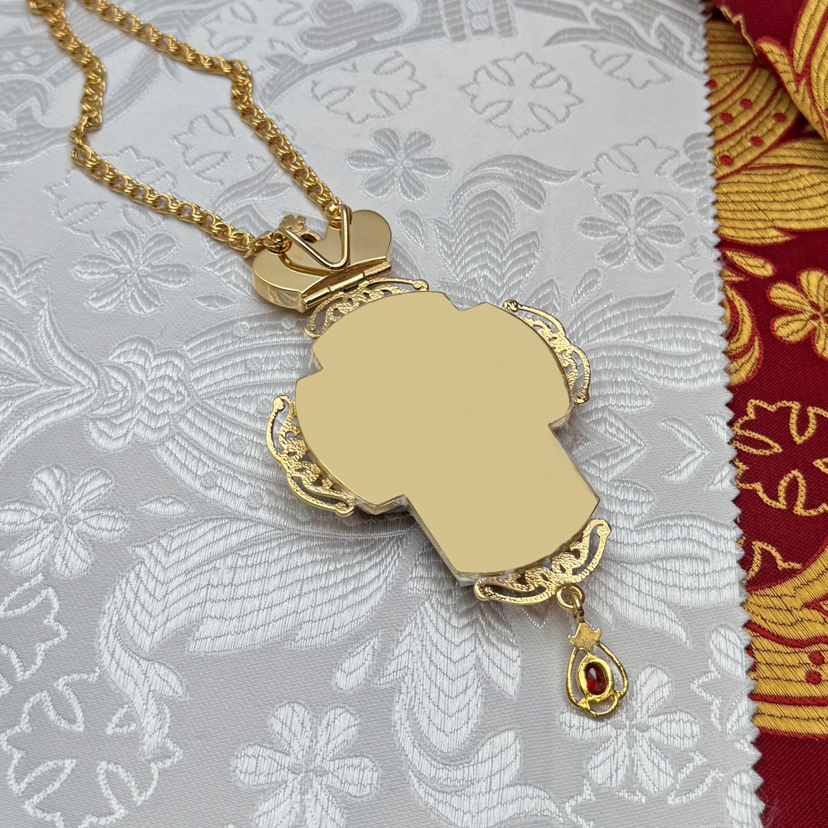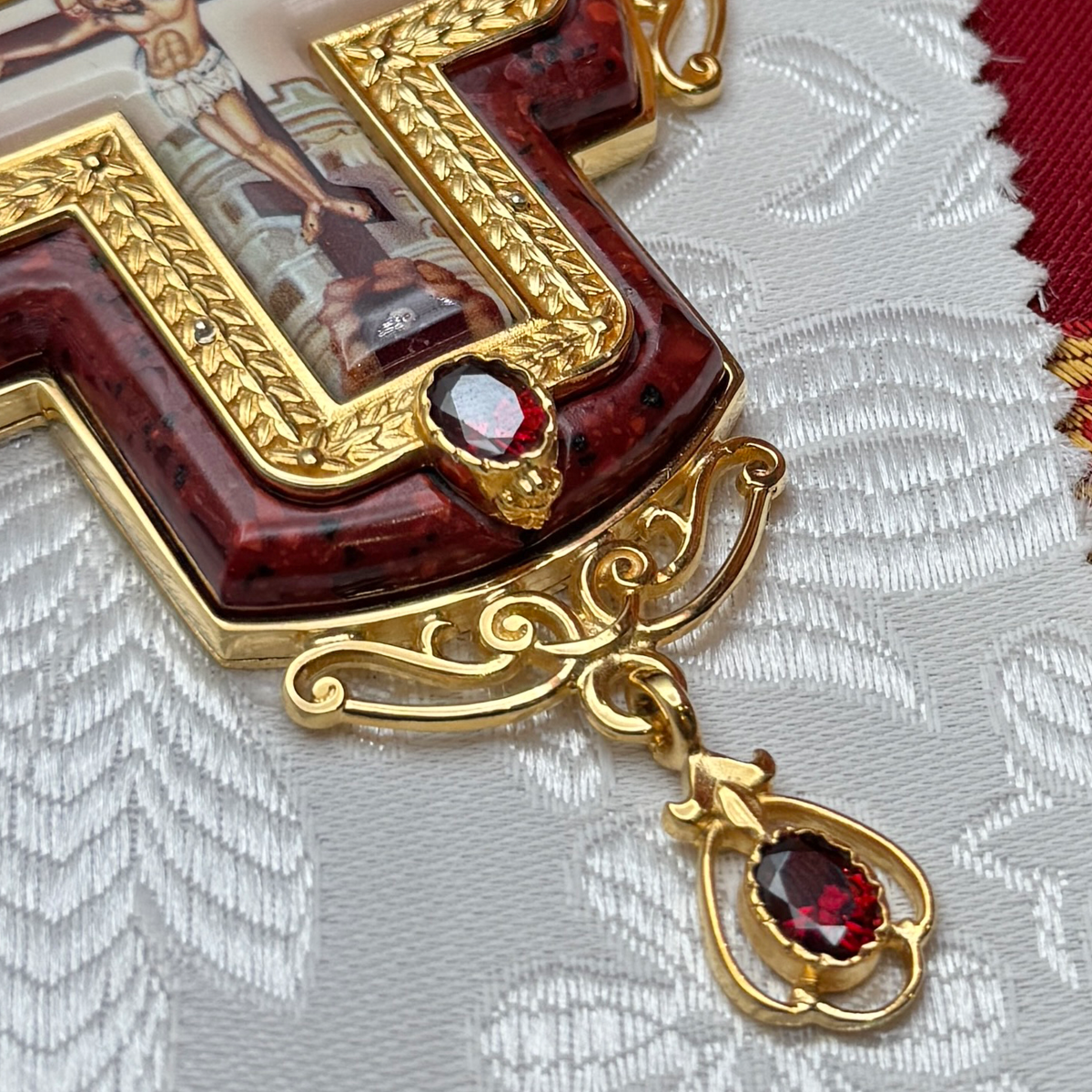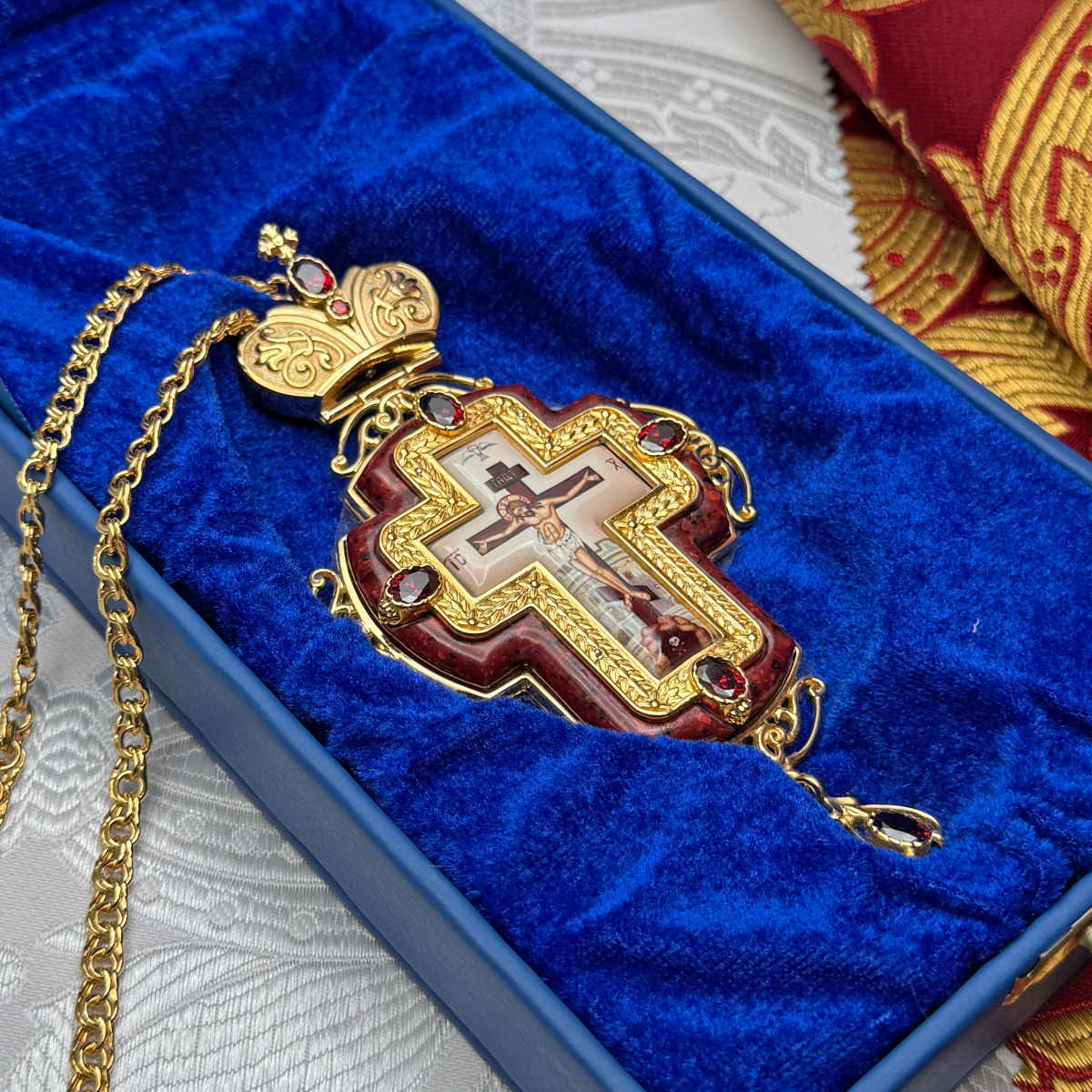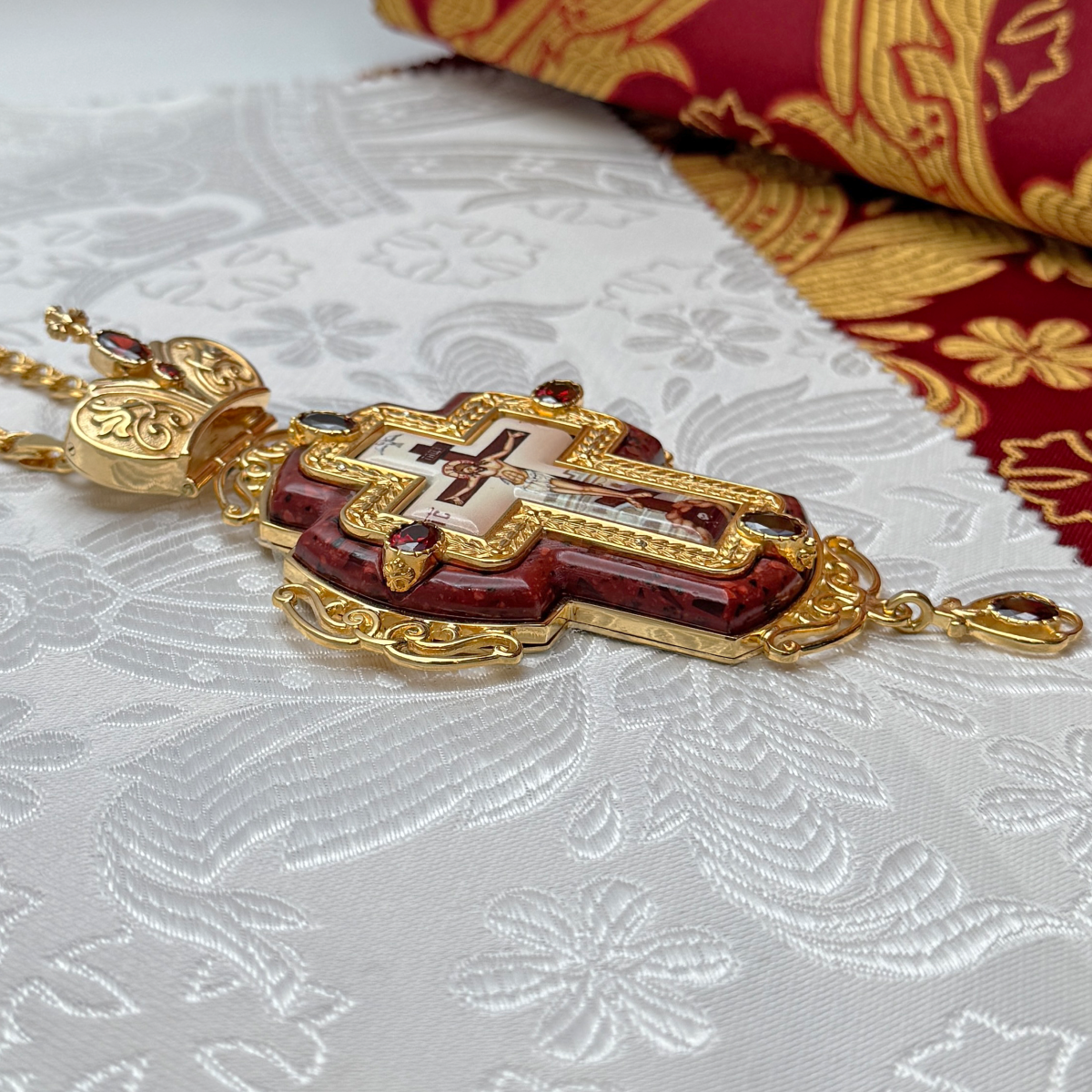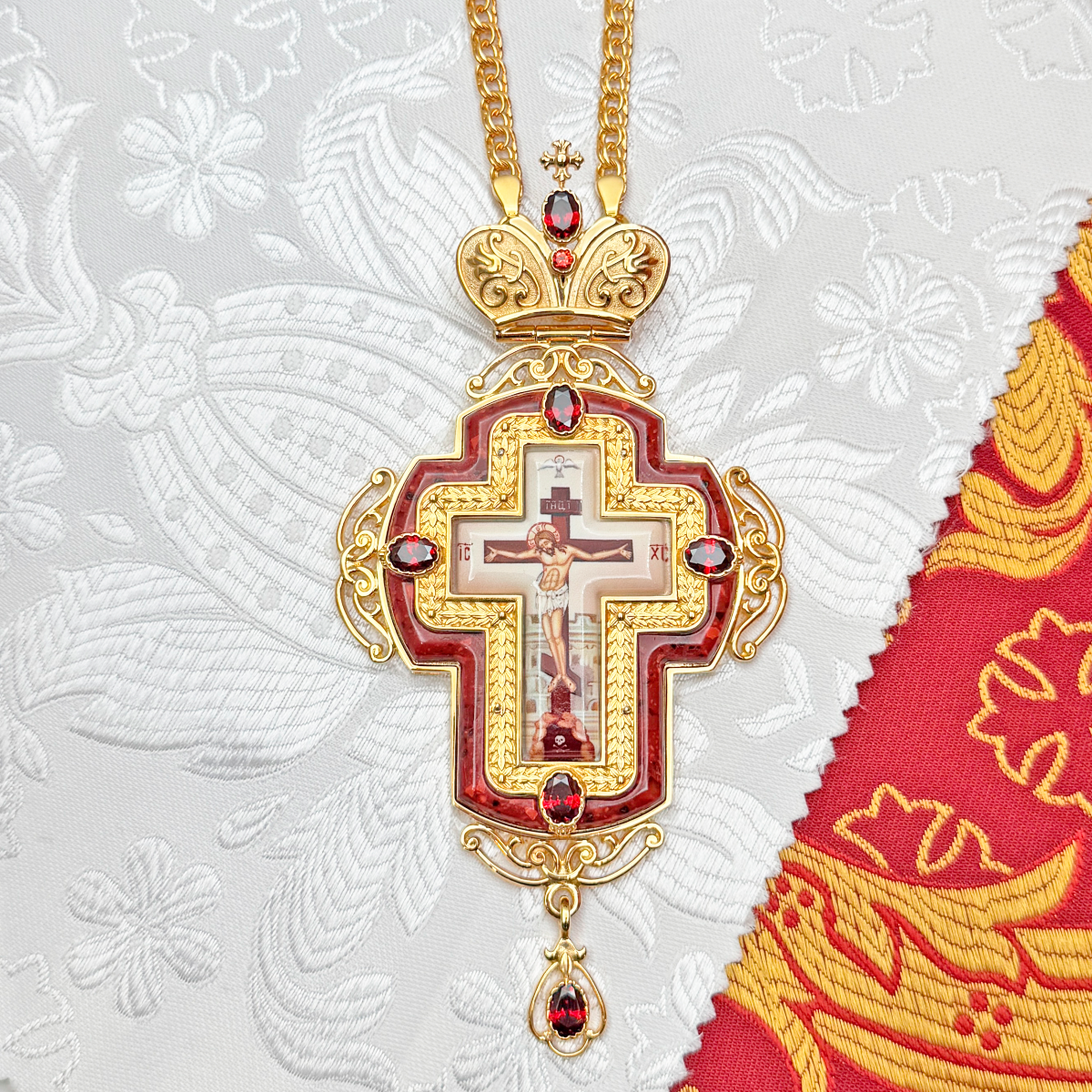 Наперсный крест изготовлен из высококачественного ювелирного сплава и позолочен гальваническим методом. Это продлевает срок службы изделия, защищает от внешних неблагоприятных воздействий. Распятие выполнено на металлической основе, покрыто специальным защитным слоем. Крест декорирован вставкой из акрила и фианитами. Продаётся в фирменной упаковке из экокожи с бархатным ложементом. На задней поверхности креста наклеена заводская плёнка.