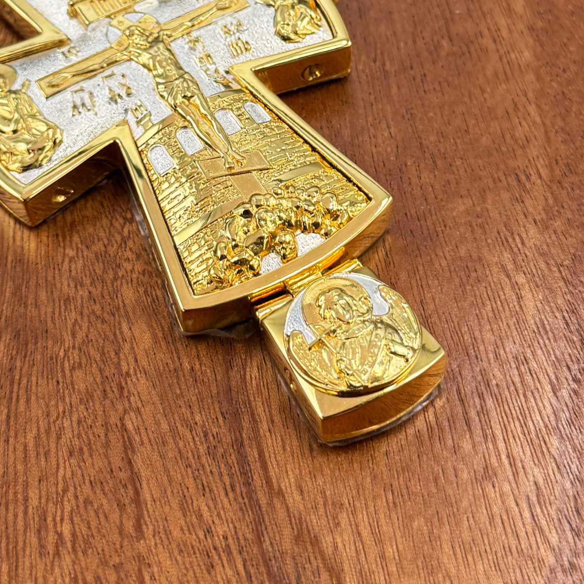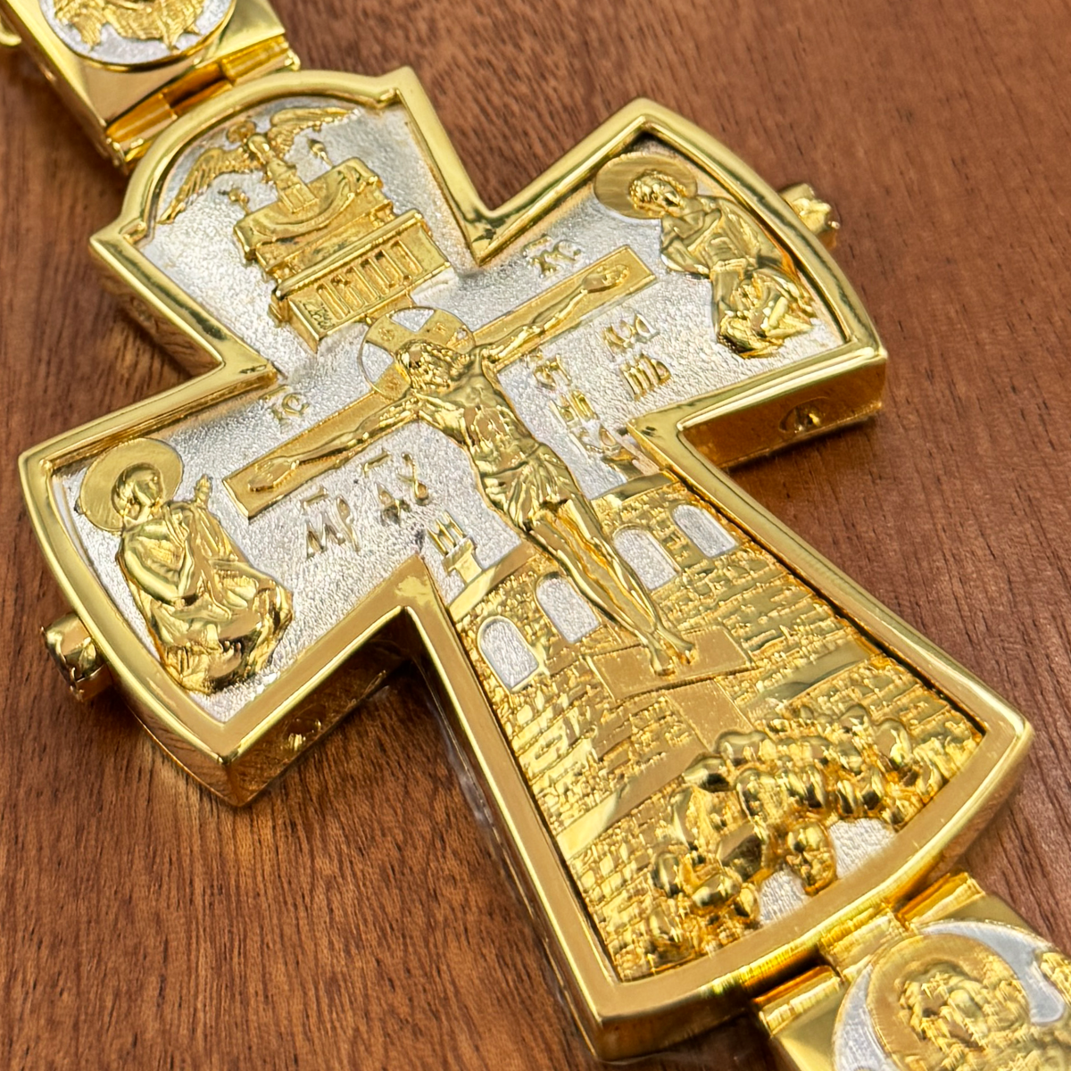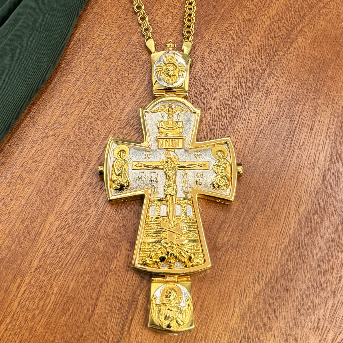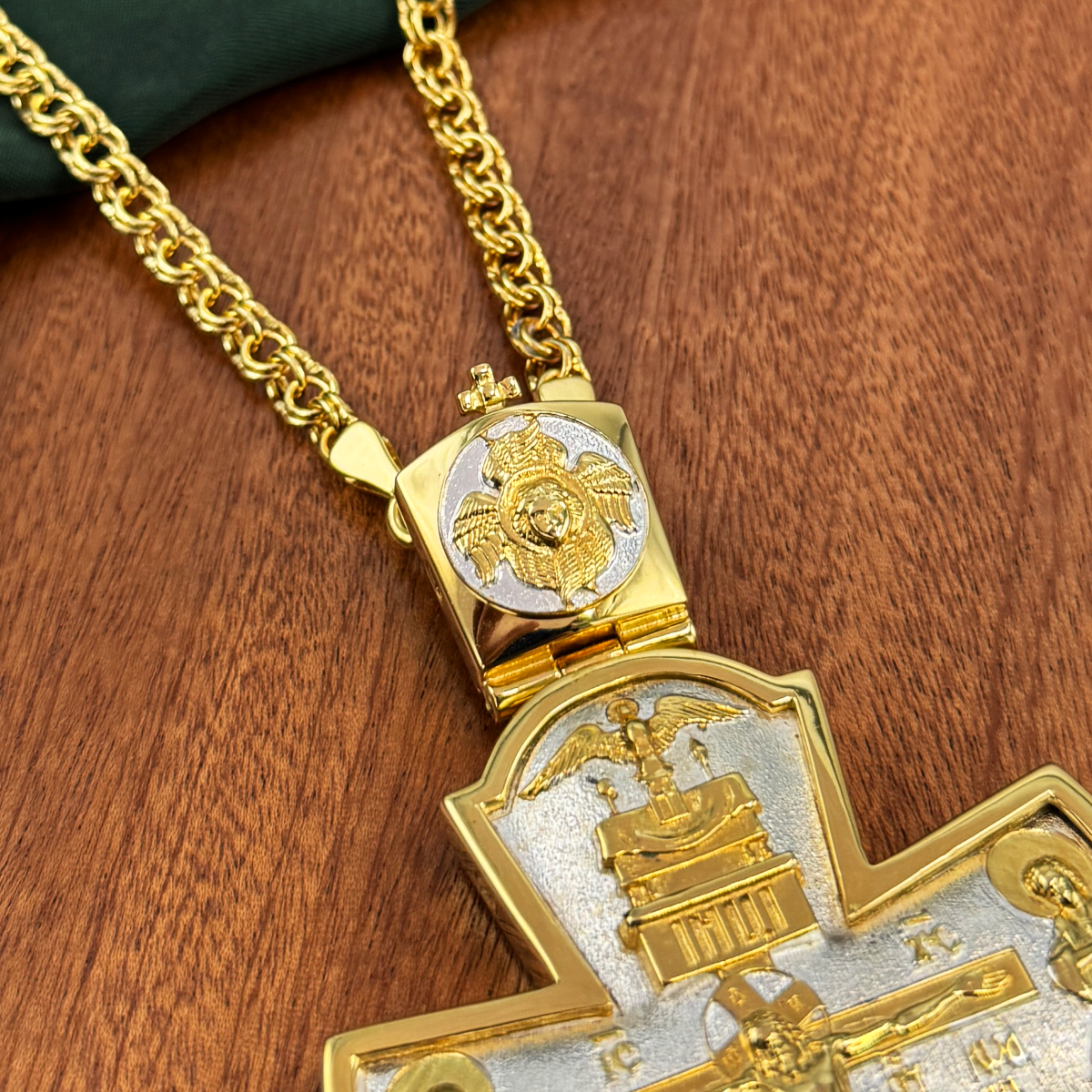 - Крест наперсный с фрагментарной позолотой и фианитами красного цвета 2.10.0408лф/1лп
