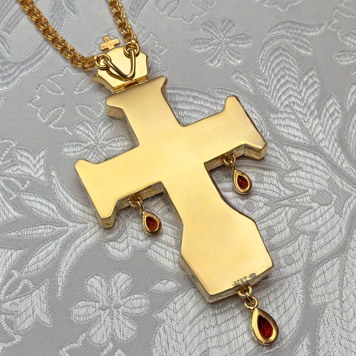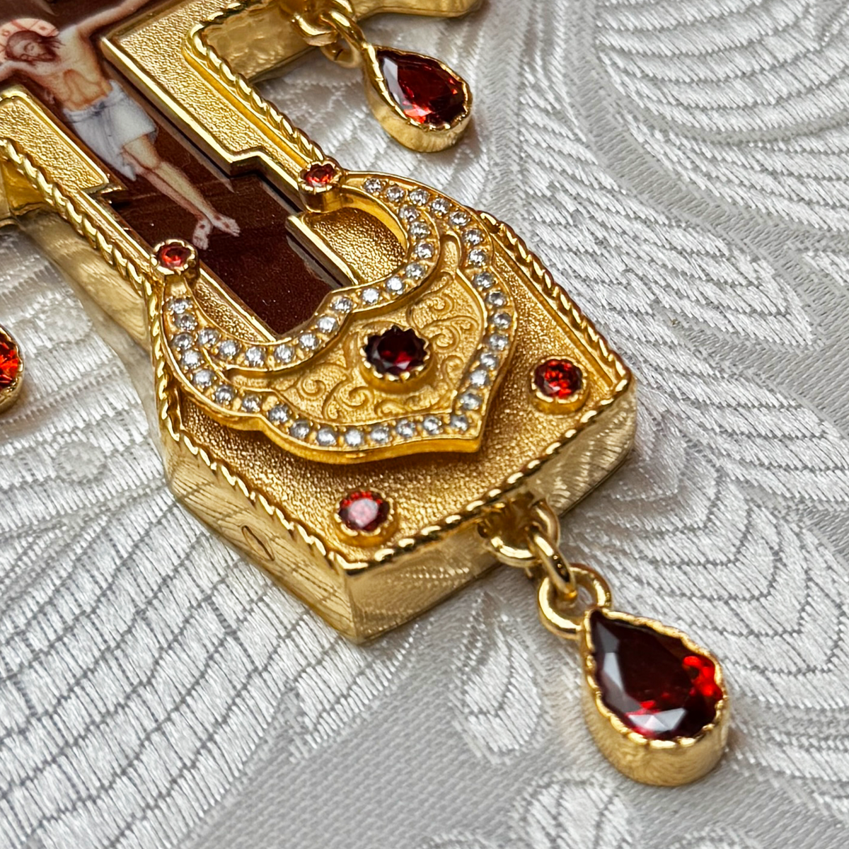 Наперсный крест изготовлен из высококачественного ювелирного сплава, покрытого позолотой гальваническим методом, такое покрытие продлевает срок службы изделия, защищает от внешних неблагоприятных воздействий. Изделие декорировано вставками из камней-фианитов. Крест продается в фирменной упаковке из экокожи с бархатным ложементом.