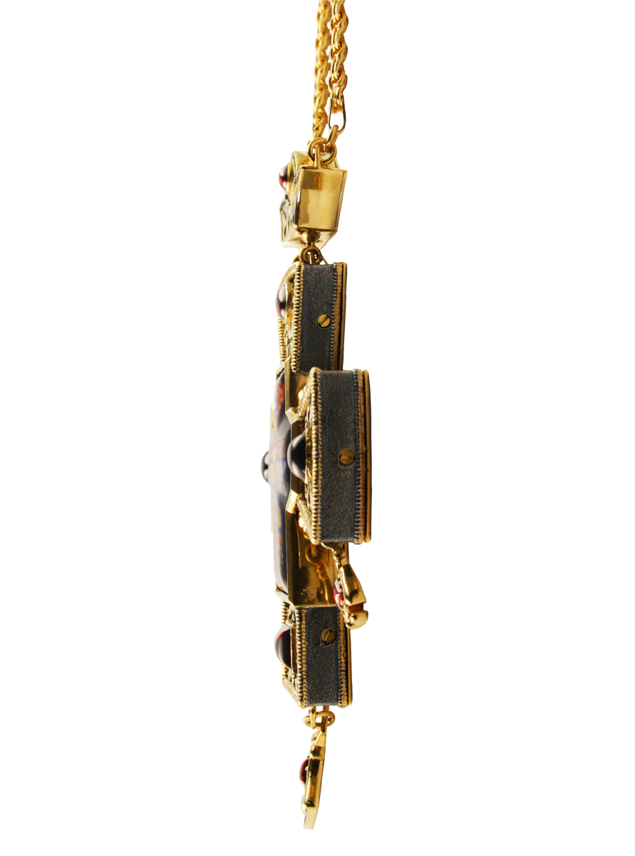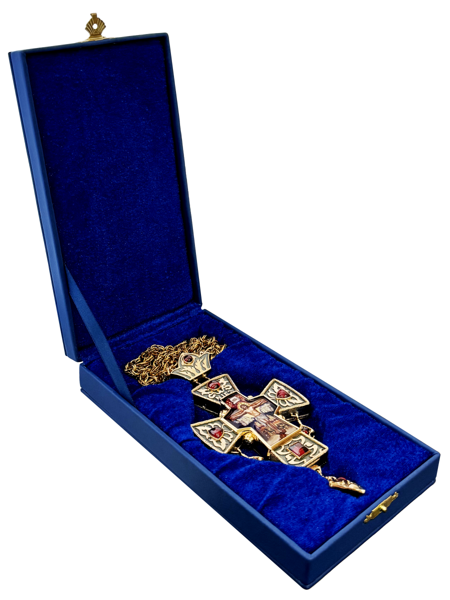 Крест наперсный изготовлен из высококачественного ювелирного сплава, покрытого позолотой и серебрением гальваническим методом. Такое покрытие продлевает срок службы изделия, защищает от внешних неблагоприятных воздействий. Крест декорирован натуральными камнями. Продается в фирменной упаковке из экокожи с бархатным ложементом.