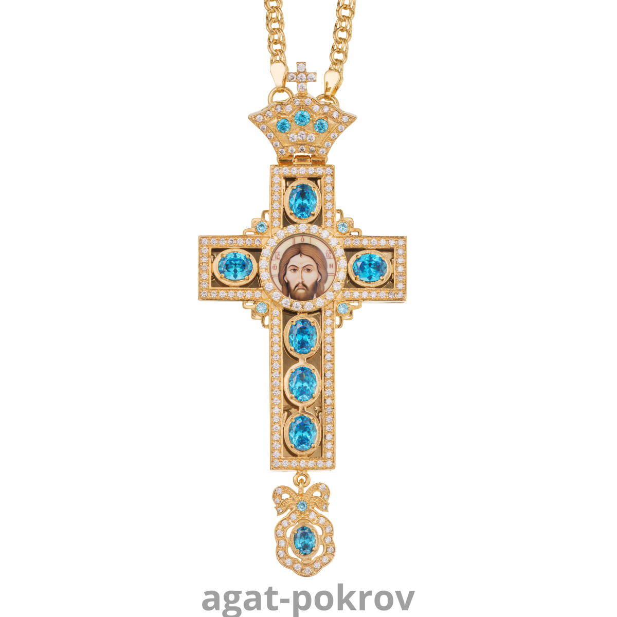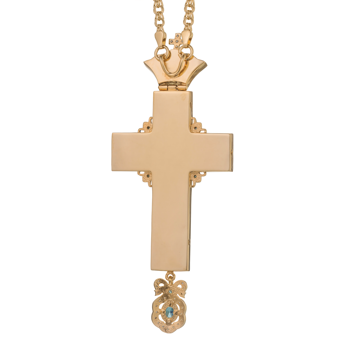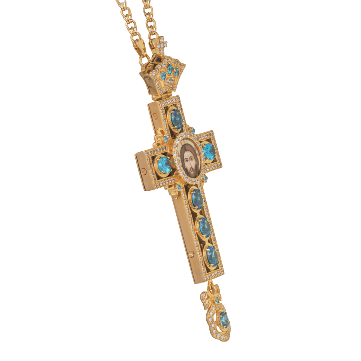 Наперсный крест изготовлен из высококачественного ювелирного сплава, покрытого позолотой гальваническим методом. Такое покрытие продлевает срок службы изделия, защищает от внешних неблагоприятных воздействий. Крест декорирован голубыми и белыми фианитами. Продаётся в фирменной упаковке из экокожи с бархатным ложементом. На задней стороне креста наклеена защитная плёнка.