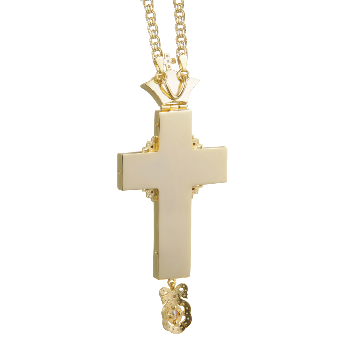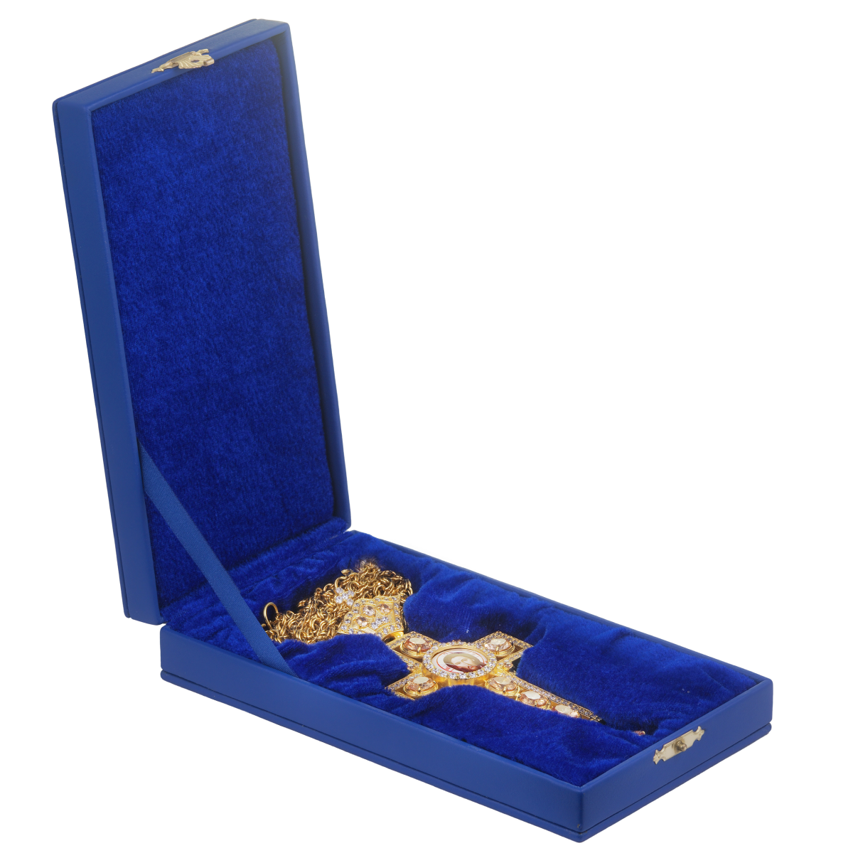 Наперсный крест изготовлен из высококачественного ювелирного сплава и покрыт позолотой гальваническим методом. Такое покрытие продлевает срок службы изделия, защищает от внешних неблагоприятных воздействий. Крест декорирован оранжевыми и белыми фианитами. Продаётся в фирменной упаковке из экокожи с бархатным ложементом. На задней стороне креста наклеена защитная плёнка.
