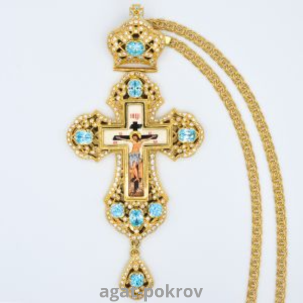Наперсный крест большого размера традиционной округлой формы изготовлен из латуни и украшен качественной поЗолотой, нанесенной гальваническим методом. Центральное распятие крупное, изготовлено по специальной технологии нанесения цветного изображения на латунную основу. Оно покрыто составом, который предохраняет его от механических повреждений и воздействия света. Крупные овальные камни-Фианиты отличного качества окружены россыпью более мелких камней контрастного цвета. Все камни ручной закрепки, поэтому будут на предназначенных им местах во все время носки креста.