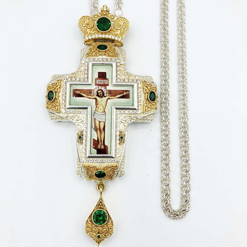 Наперсный крест изготовлен из высококачественного ювелирного сплава с применением исключительно ручного труда. Он покрыт надежным и долговечным серебрением с элементами позолоты при помощи технологи – гальваника. Толщина покрытия при таком нанесении драгоценного металла не менее 10 микрон, что обеспечивает простоту в уходе за изделием. Чтобы вернуть ему первоначальный вид – достаточно просто протереть панагию мягкой сухой тканью и хранить его без доступа влаги. Распятие выполнено по специальной технологии нанесения цветного изображения на металлическую основу. Оно покрыто защитным составом, который предохранит его от выгорания цвета и повреждений. Лицевая сторона креста украшена растительным орнаментом со вставками камней кубического циркония (фианиты). Изделие продается в презентабельной упаковке из кожвинила с бархатным ложементом.