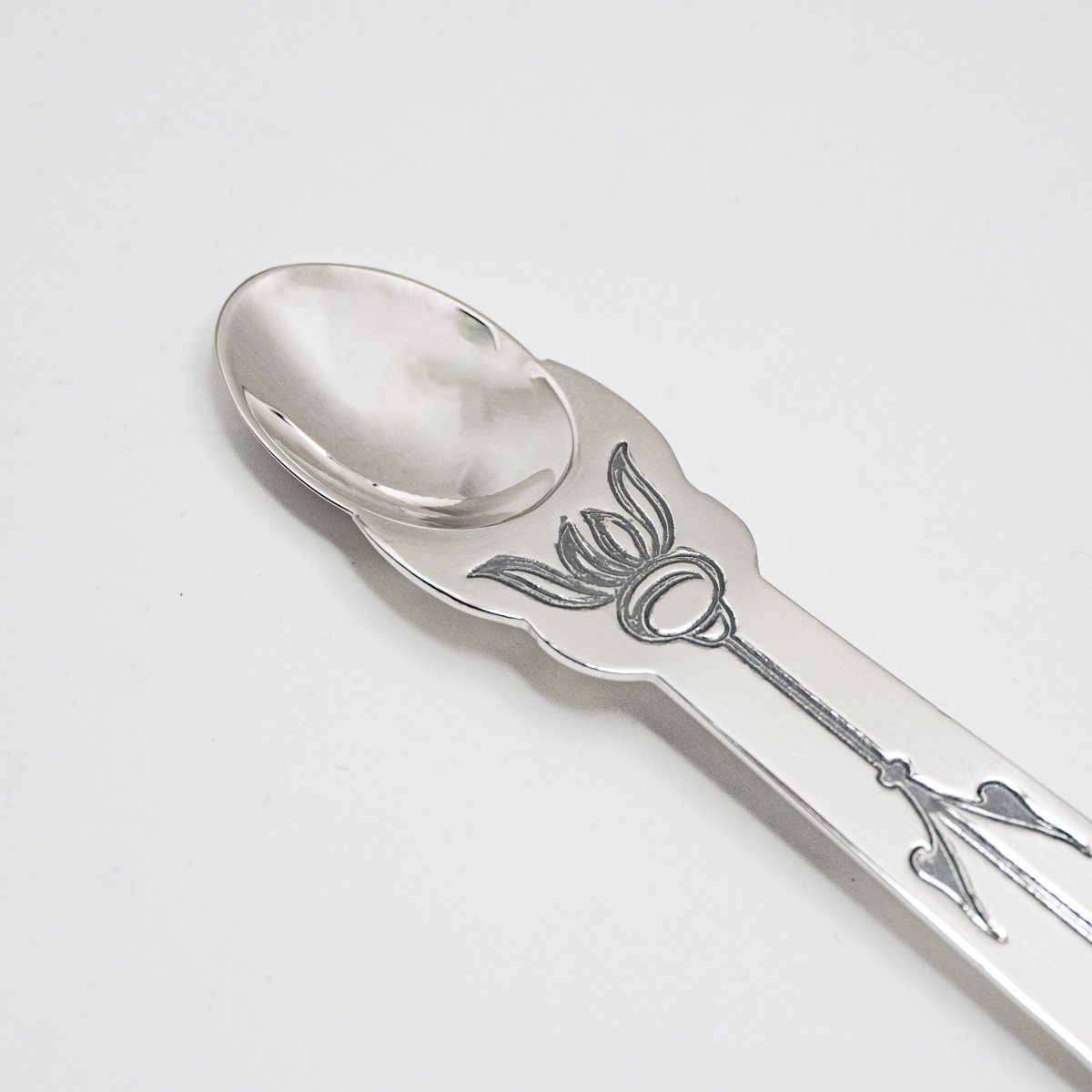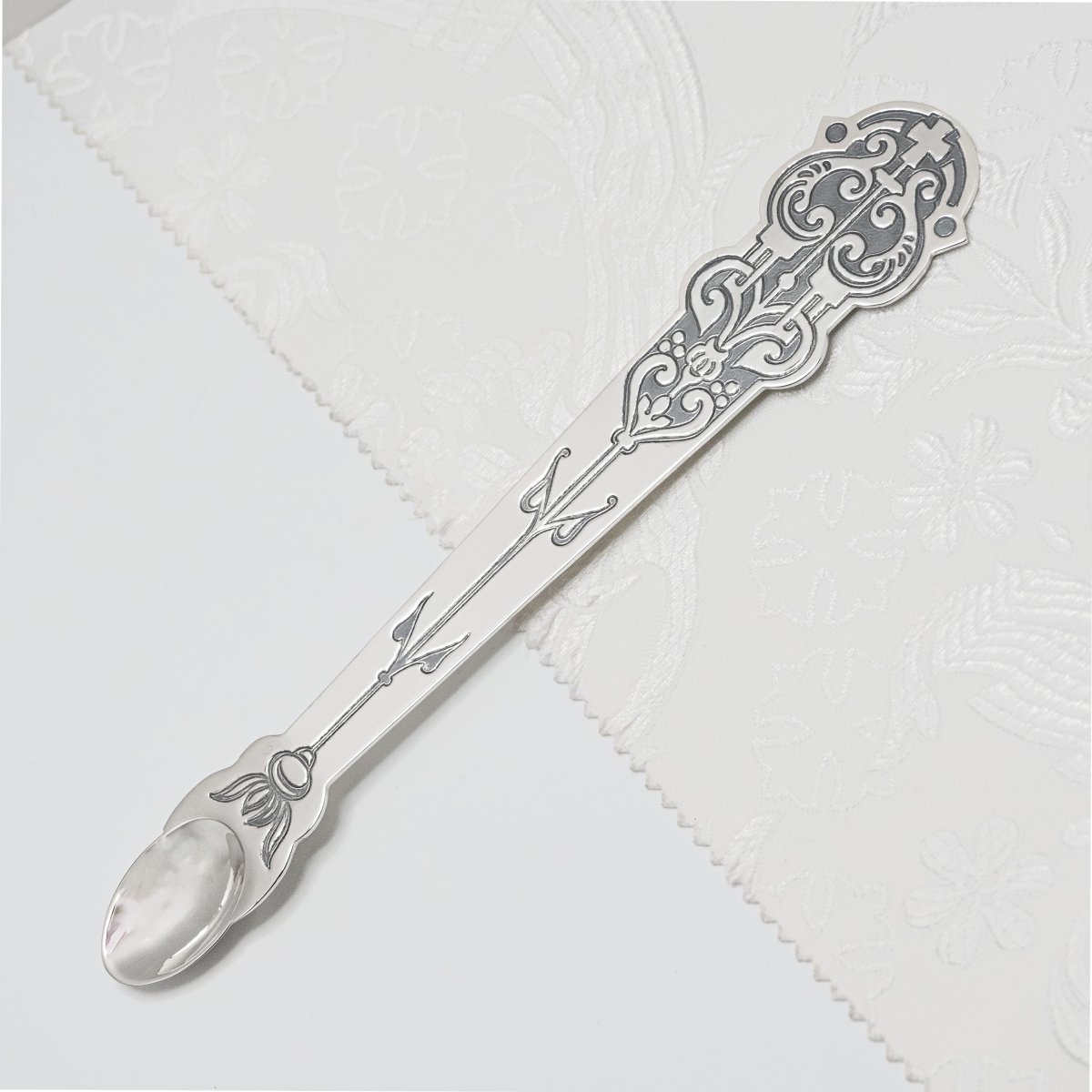 Лжица изготовлена из высококачественного ювелирного сплава, покрытого серебрением гальваническим методом. Такое покрытие продлевает срок службы изделия, защищает от внешних неблагоприятных воздействий. Изделие декорировано узорами, покрытыми чернением. Лжица продается в фирменной упаковке из экокожи с бархатным ложементом.