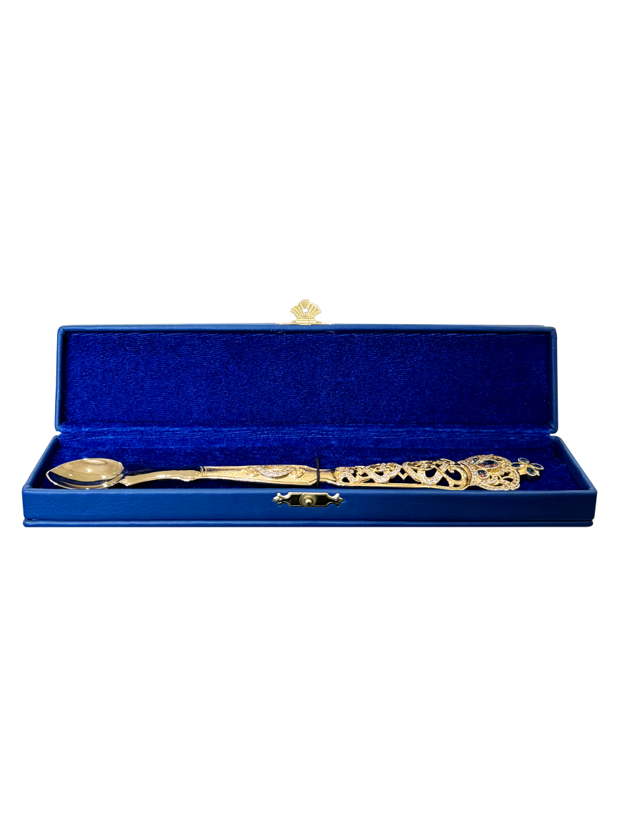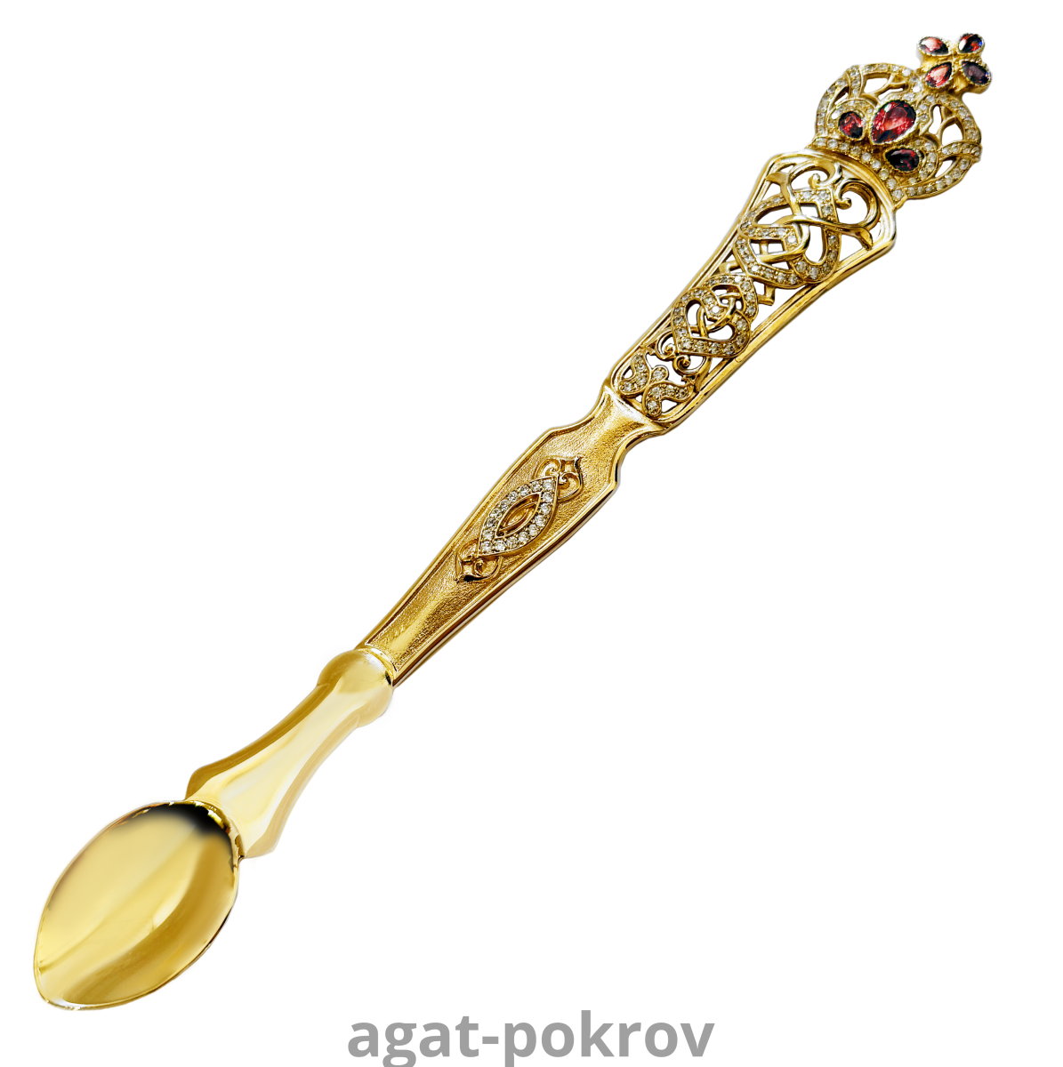 Практичная лжица, изготовленная из ювелирного сплава и покрыта качественной позолотой, нанесенной гальваническим способом. Изделие украшено камнями-фианитами. Изделие реализуется в упаковке из экокожи с бархатным ложементом.