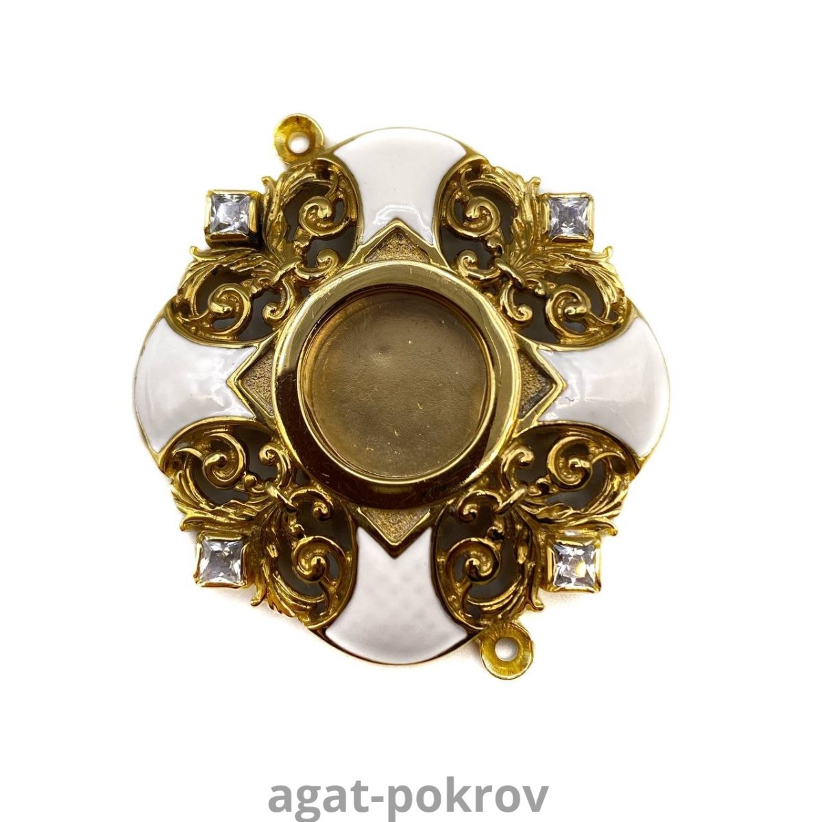 Мощевик изготовлен из высококачественного ювелирного сплава, покрытого позолотой гальваническим методом. Изделие декорировано вставками из эмали и фианитами.