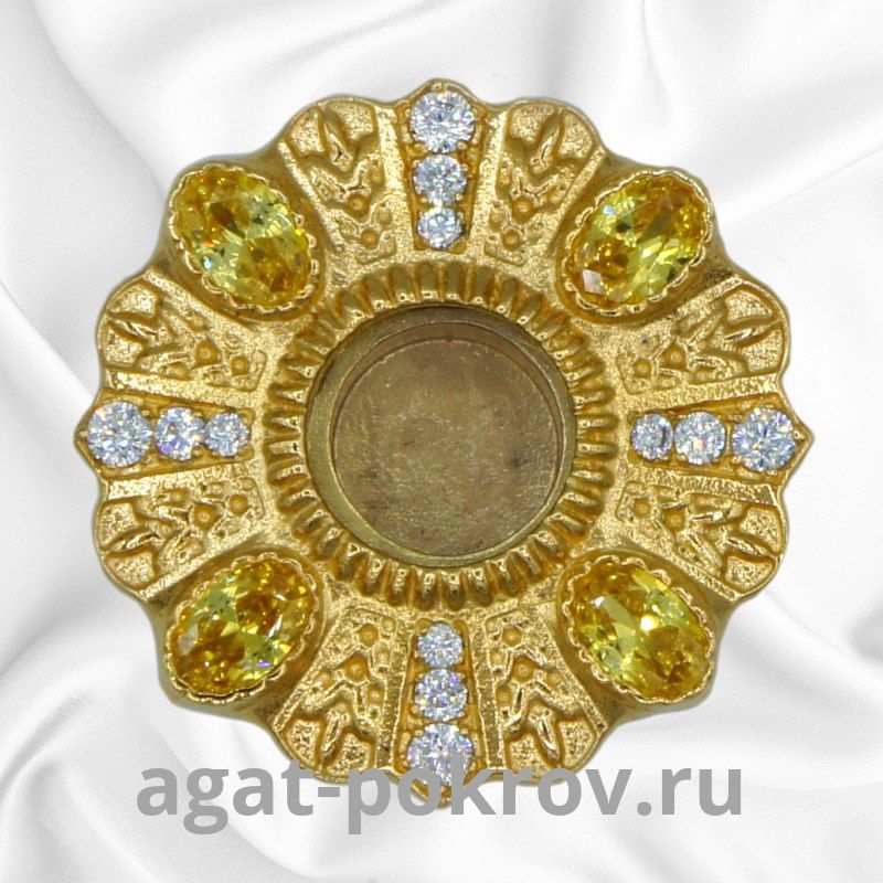 Нарядный латунный, врезной мощевик небольшого размера изготовлен из латуни и покрыт качественной поЗолотой, нанесенной гальваническим способом. Такая технология нанесения гарантирует неизменный вид изделия на очень длительный срок. Мощевик декорирован вставками камней-Фианитов отличного качества, ручной закрепки. Место под святую частицу 6 мм.