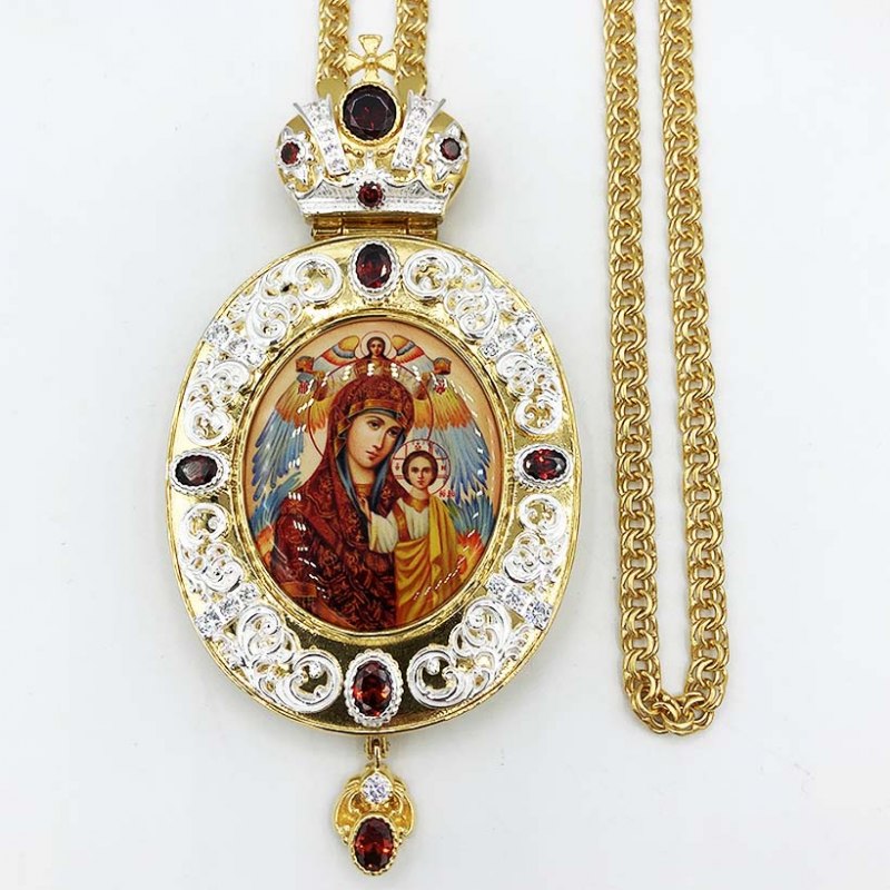 Архиерейская панагия изготовлена из высококачественного ювелирного сплава с применением исключительно ручного труда. Образ Богородицы «Казанская» выполнен по специальной технологии нанесения цветного изображения на металлическую основу. Икона покрыта защитным составом, который предохранит ее от выгорания цвета и повреждений. По вашему заказу икона на панагии может быть любой. Панагия покрыта надежной и долговечной позолотой при помощи технологии гальваники. Толщина покрытия при таком нанесении драгоценного металла не менее 4 микрон, что обеспечивает простоту в уходе за изделием. Чтобы вернуть ему первоначальный вид – достаточно просто протереть панагию мягкой сухой тканью и хранить его без доступа влаги. Лицевая сторона панагии украшена растительным орнаментом, акцентированном серебрением и вставками качественных камней кубического циркония (фианиты). Изделие продается в презентабельной упаковке из кожвинила с бархатным ложементом.