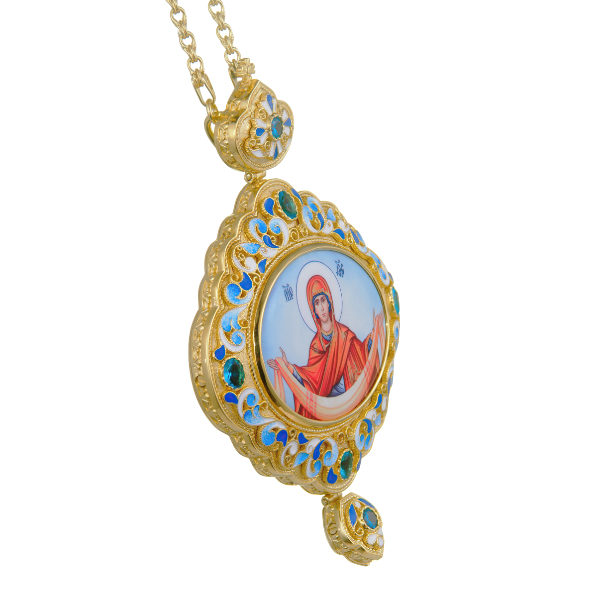 Архиерейская панагия изготовлена из высококачественного ювелирного сплава с применением исключительно ручного труда. Образ Богородицы выполнен по специальной технологии нанесения цветного изображения на металлическую основу. Он покрыт защитным составом, который предохраняет его от выгорания цвета и различных повреждений, по вашему заказу икона на панагии может быть любой. Панагия покрыта надежной и долговечной позолотой в 24 карата при помощи гальваники, за ней очень просто ухаживать. Панагия продается в презентабельной упаковке из кожвинила с бархатным ложементом.