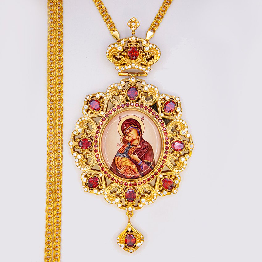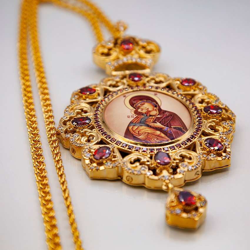 Архиерейская панагия изготовлена из высококачественного ювелирного сплава с применением исключительно ручного труда. Образ Богородицы выполнен по специальной технологии нанесения цветного изображения на металлическую основу. Он покрыт защитным составом, который предохраняет его от выгорания цвета и различных повреждений, по вашему заказу икона на панагии может быть любой. Панагия покрыта надежной и долговечной позолотой в 24 карата при помощи гальваники, за ней очень просто ухаживать. Панагия продается в презентабельной упаковке из кожвинила с бархатным ложементом.