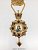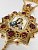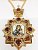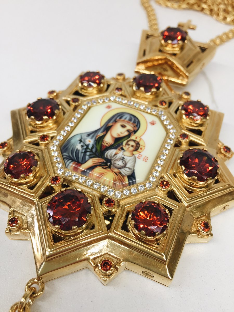Панагия изготовлена из высококачественного ювелирного сплава, покрытого позолотой гальваническим методом, такое покрытие продлевает срок службы изделия, защищает от внешних неблагоприятных воздействий. Изделие декорировано красными и белыми фианитами разного диаметра. Панагия продается в фирменной упаковке из экокожи с бархатным ложементом.