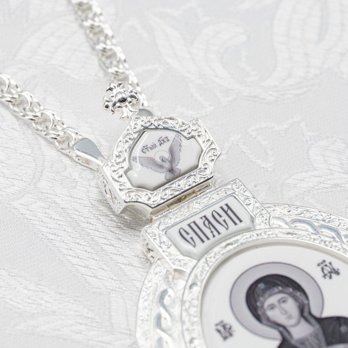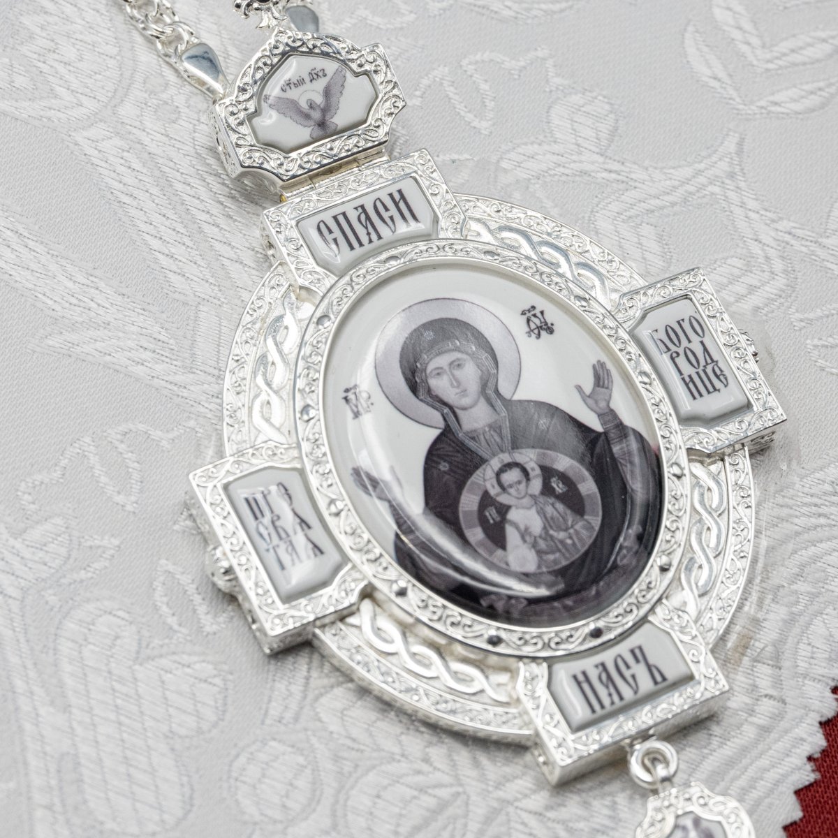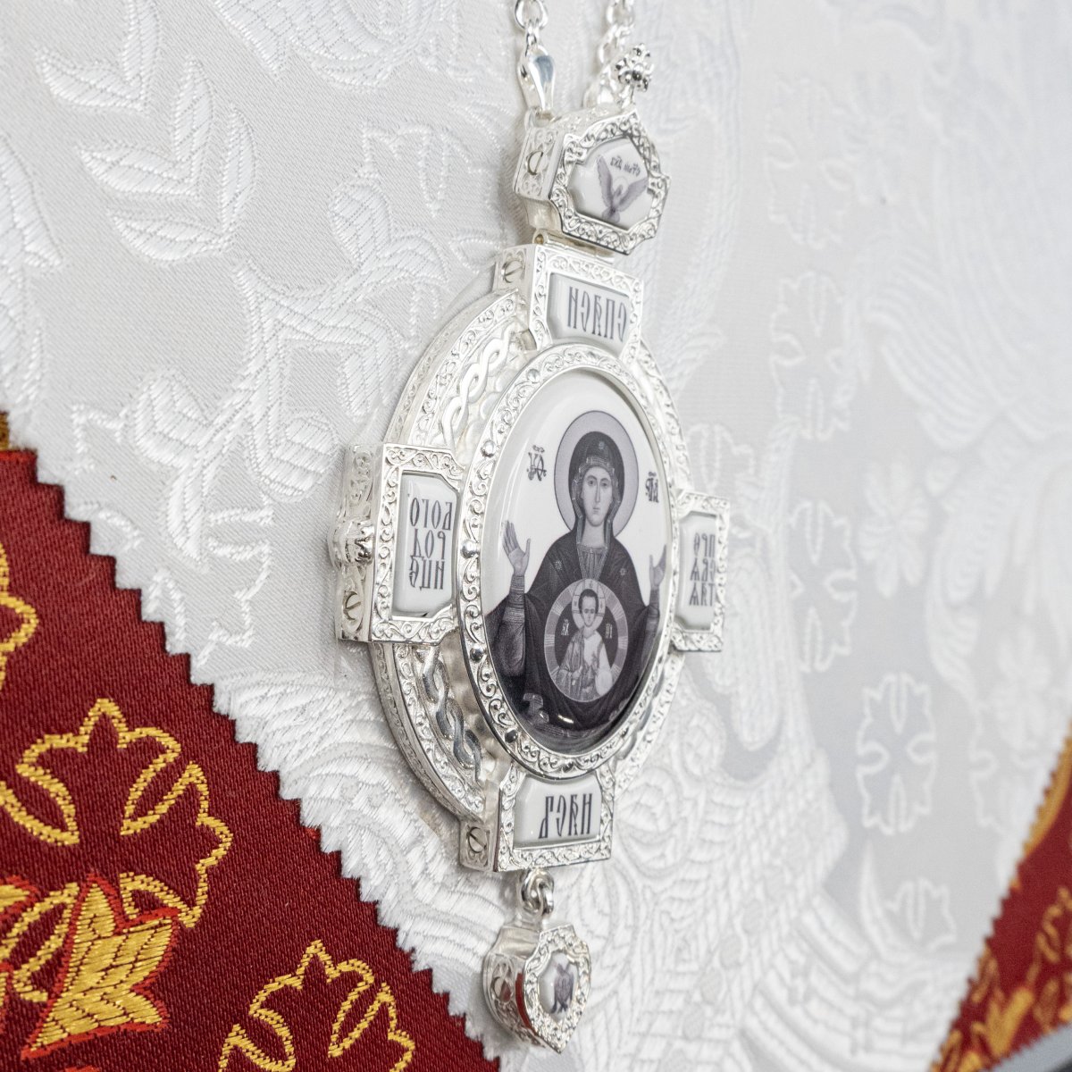 Архиерейская панагия изготовлена из высококачественного ювелирного сплава с применением исключительно ручного труда. Образ Богородицы выполнен по специальной технологии нанесения цветного изображения на металлическую основу. Он покрыт защитным составом, который предохраняет его от выгорания цвета и различных повреждений, по вашему заказу икона на панагии может быть любой. Панагия покрыта надежным и долговечным серебрением при помощи гальваники, за ней очень просто ухаживать. Панагия продается в презентабельной упаковке из кожвинила с бархатным ложементом.