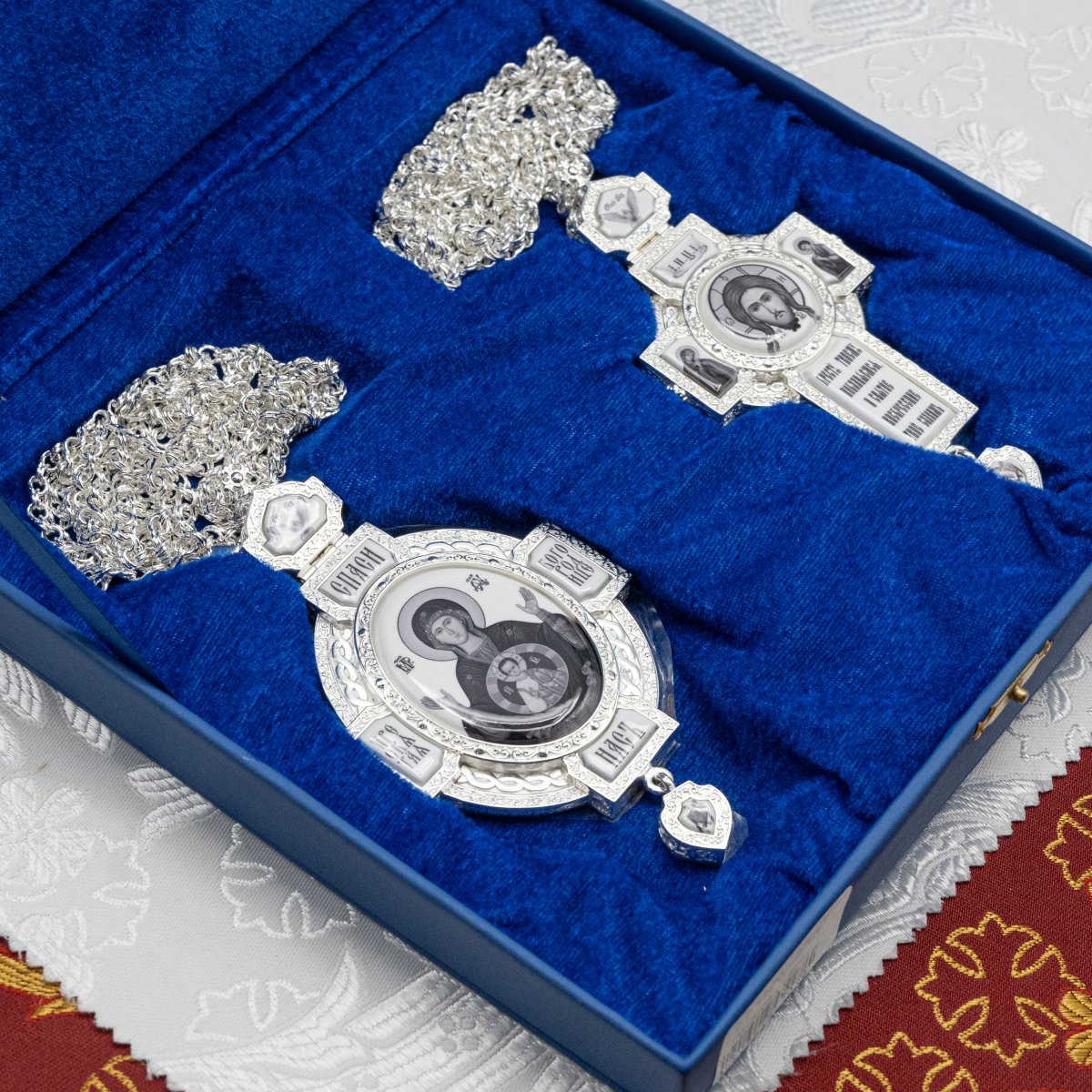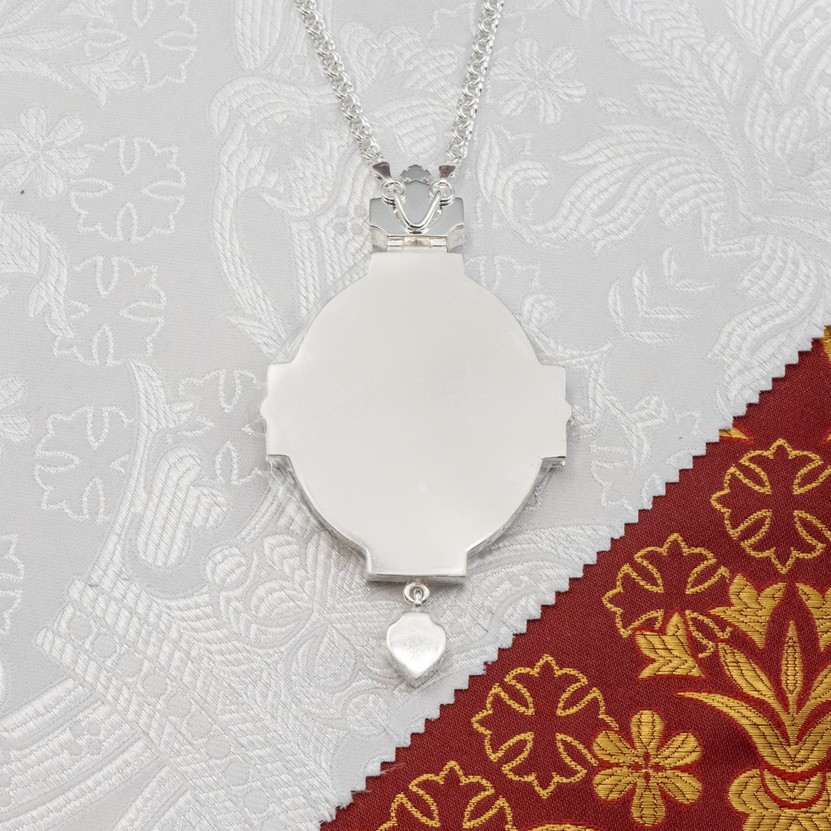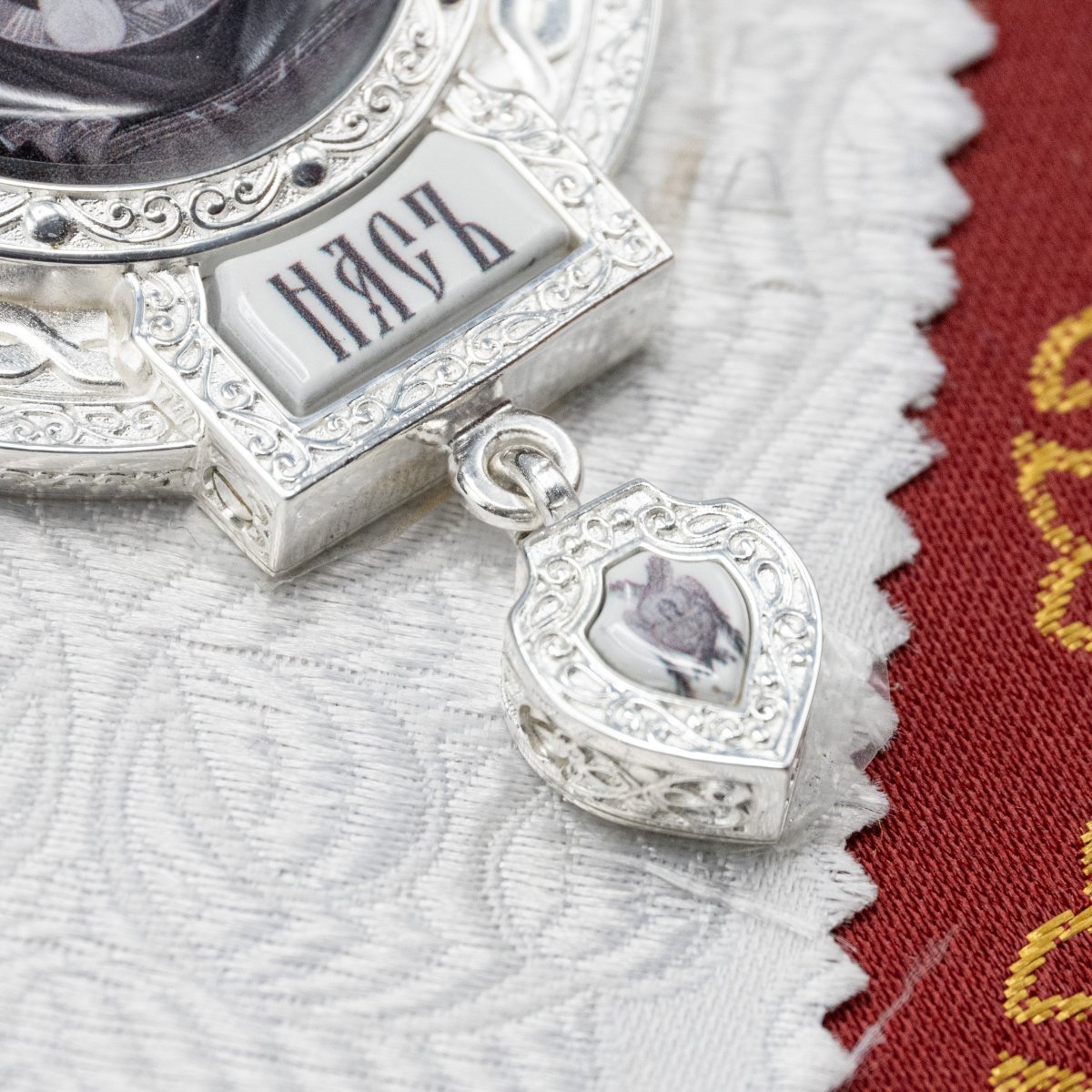 Архиерейская панагия изготовлена из высококачественного ювелирного сплава с применением исключительно ручного труда. Образ Богородицы выполнен по специальной технологии нанесения цветного изображения на металлическую основу. Он покрыт защитным составом, который предохраняет его от выгорания цвета и различных повреждений, по вашему заказу икона на панагии может быть любой. Панагия покрыта надежным и долговечным серебрением при помощи гальваники, за ней очень просто ухаживать. Панагия продается в презентабельной упаковке из кожвинила с бархатным ложементом.