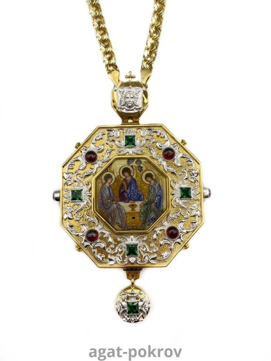 Панагия изготовлена из высококачественного ювелирного сплава, покрытого серебрением и позолотой гальваническим методом, такое покрытие продлевает срок службы изделия, защищает от внешних неблагоприятных воздействий. Образ выполнен по специальной технологии нанесения цветного изображения на латунную основу. Продается в фирменной упаковке из экокожи с бархатным ложементом.