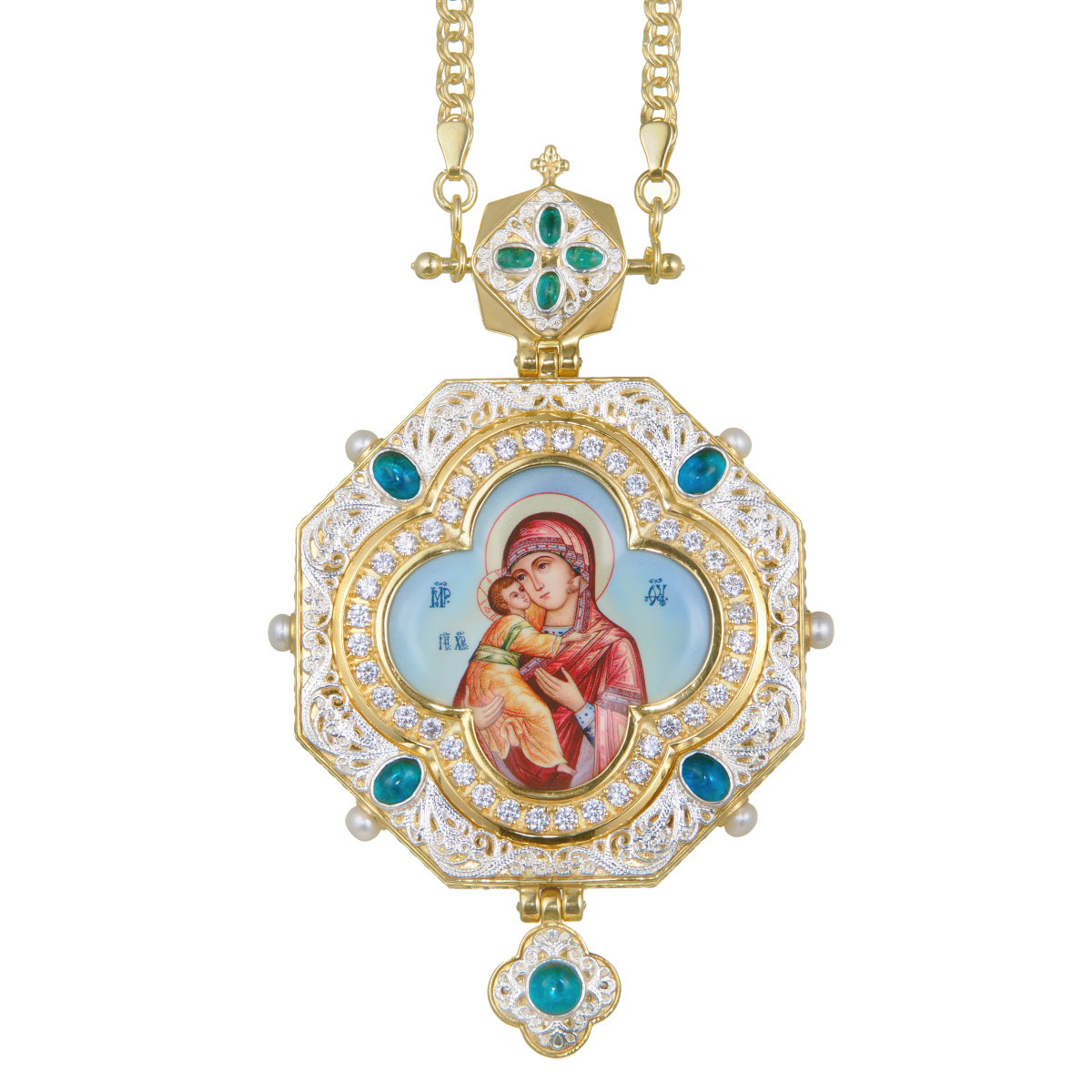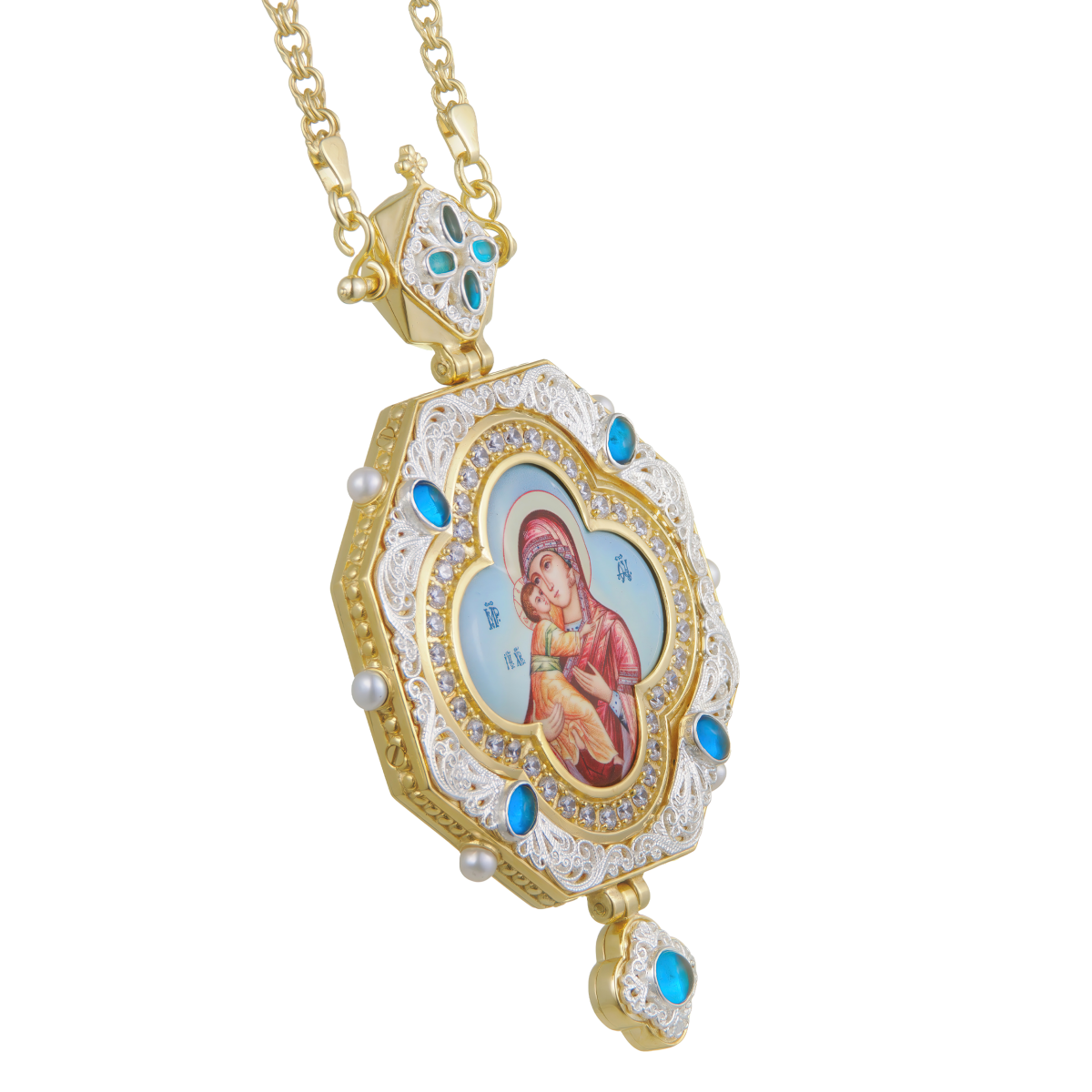 Панагия изготовлена из качественного ювелирного сплава и покрыта благородным слоем позолоты. Панагия сосредоточена на духовности и традициях Церкви. Образ Богоматери выполнен по специальной технологии нанесения детализированного изображения на латунную основу, покрытую защитным слоем. Изделие усыпано вставками из качественных камней-фианитов. Позолота обеспечивает долгий срок службы и элегантный внешний вид.