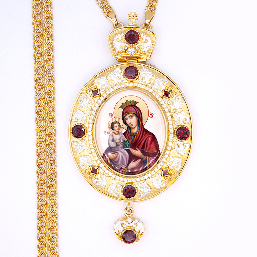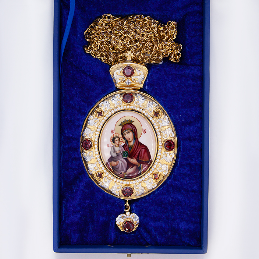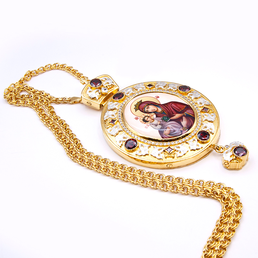 Архиерейская панагия изготовлена из высококачественного ювелирного сплава с применением исключительно ручного труда. Образ Богородицы выполнен по специальной технологии нанесения цветного изображения на металлическую основу. Он покрыт защитным составом, который предохраняет его от выгорания цвета и различных повреждений, по вашему заказу икона на панагии может быть любой. Панагия покрыта надежной и долговечной позолотой в 24 карата при помощи гальваники, за ней очень просто ухаживать. Панагия продается в презентабельной упаковке из кожвинила с бархатным ложементом.