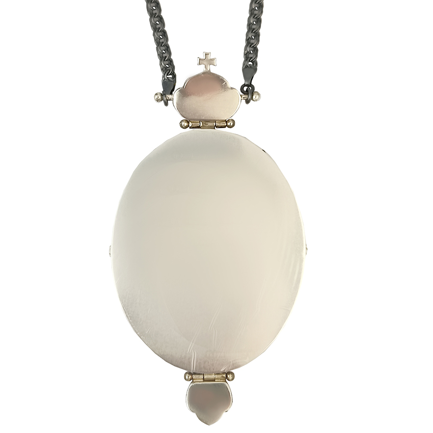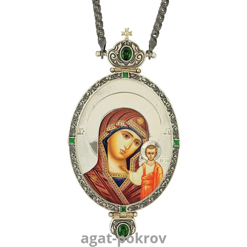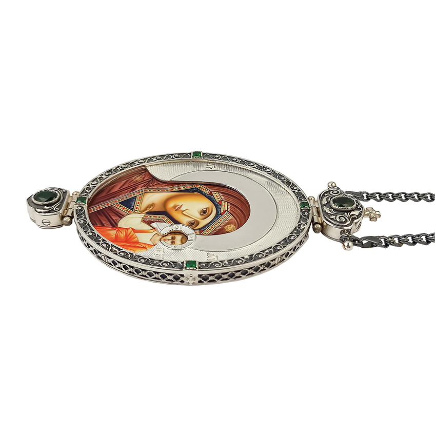 Архиерейская панагия изготовлена из высококачественного ювелирного сплава с применением исключительно ручного труда. Образ выполнен по специальной технологии нанесения цветного изображения на металлическую основу. Он покрыт защитным составом, который предохраняет его от выгорания цвета и различных повреждений, по вашему заказу икона на панагии может быть любой. Панагия покрыта надежным серебрением при помощи гальваники, за ней очень просто ухаживать. Панагия продается в презентабельной упаковке из кожвинила с бархатным ложементом.
