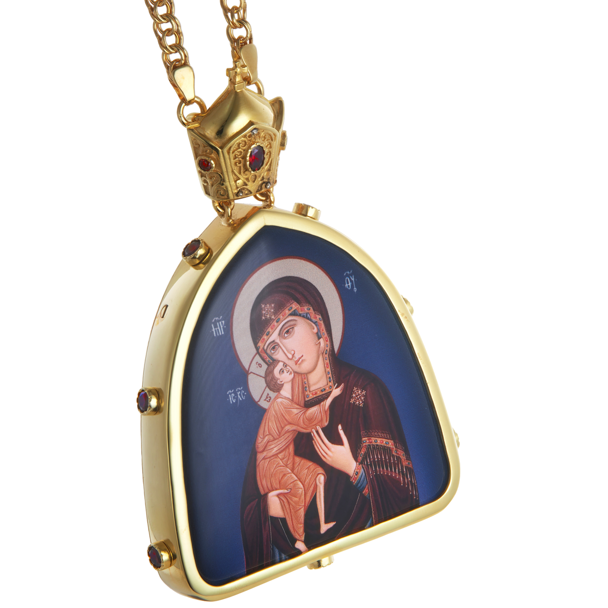 Панагия изготовлена из качественного ювелирного сплава и покрыта благородным слоем позолоты. Панагия сосредоточена на духовности и традициях Церкви. Образ Богоматери выполнен по специальной технологии нанесения детализированного изображения на латунную основу, покрытую защитным слоем. Изделие усыпано вставками из качественных камней-фианитов красного цвета. Позолота обеспечивает долгий срок службы и элегантный внешний вид.