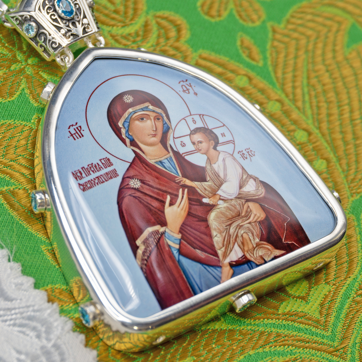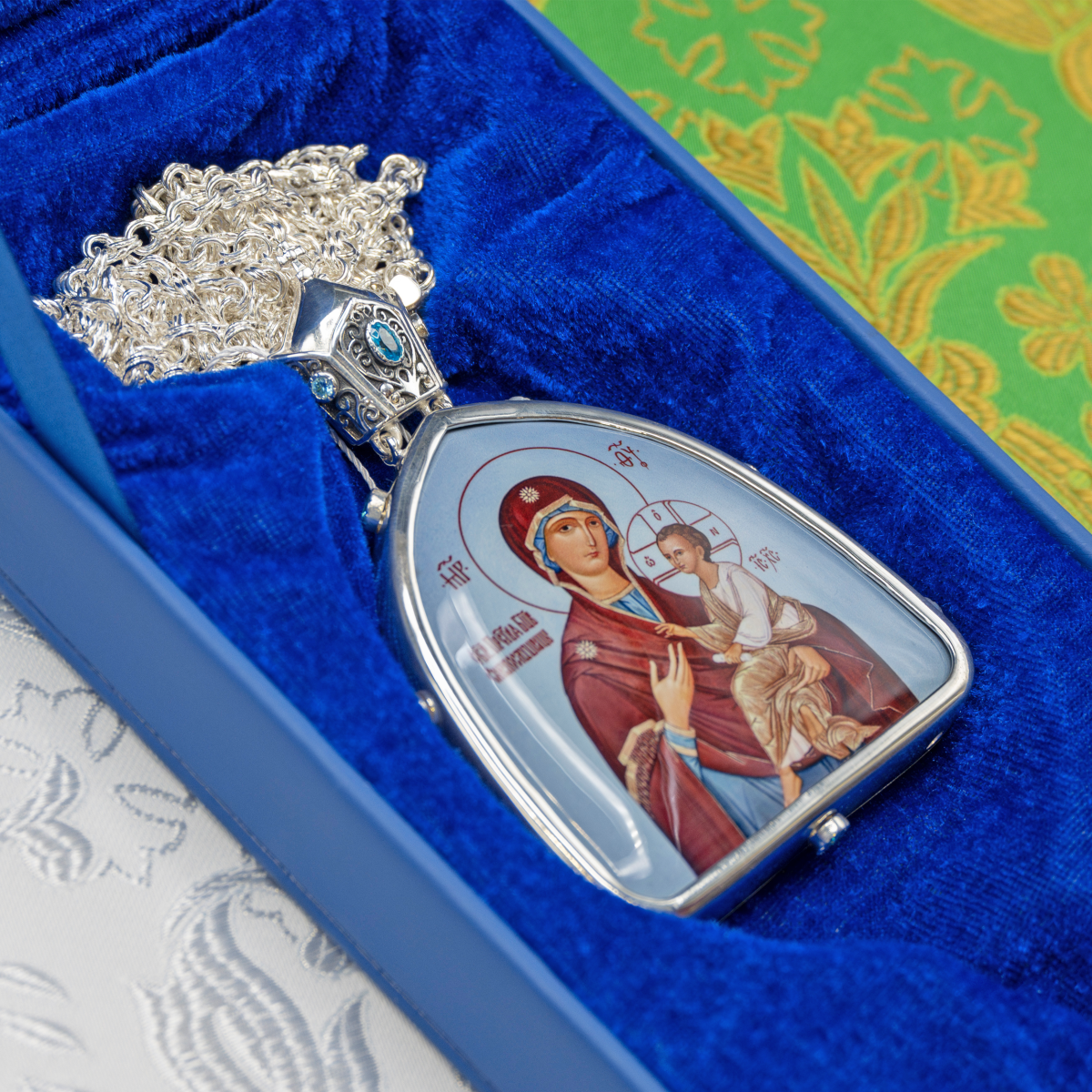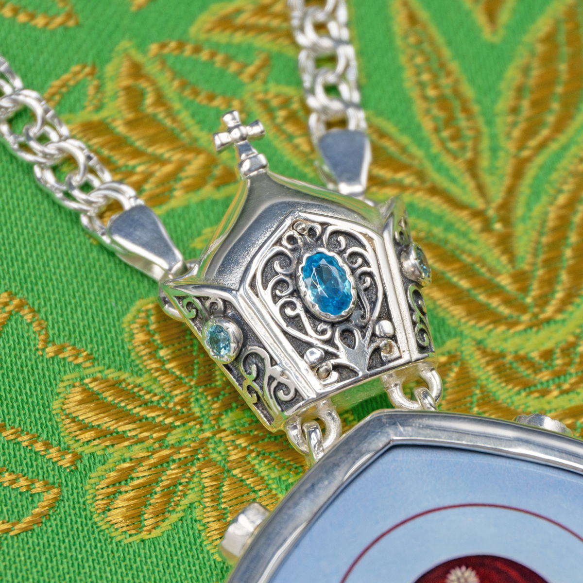 Панагия изготовлена из высококачественного ювелирного сплава, покрытого серебрением гальваническим методом. Такая технология нанесения гарантирует неизменный первоначальный вид изделий на очень длительный срок и простоту в уходе. Изделие декорировано вставками из камней-фианитов голубого цвета ручной закрепки, а также акцентным патинированием короны панагии. Изделие продается в фирменной упаковке из экокожи с бархатным ложементом.