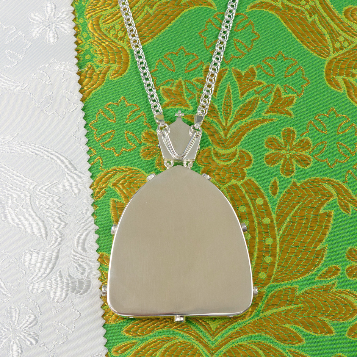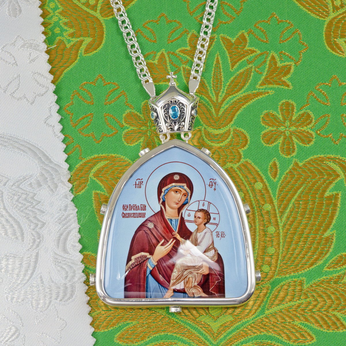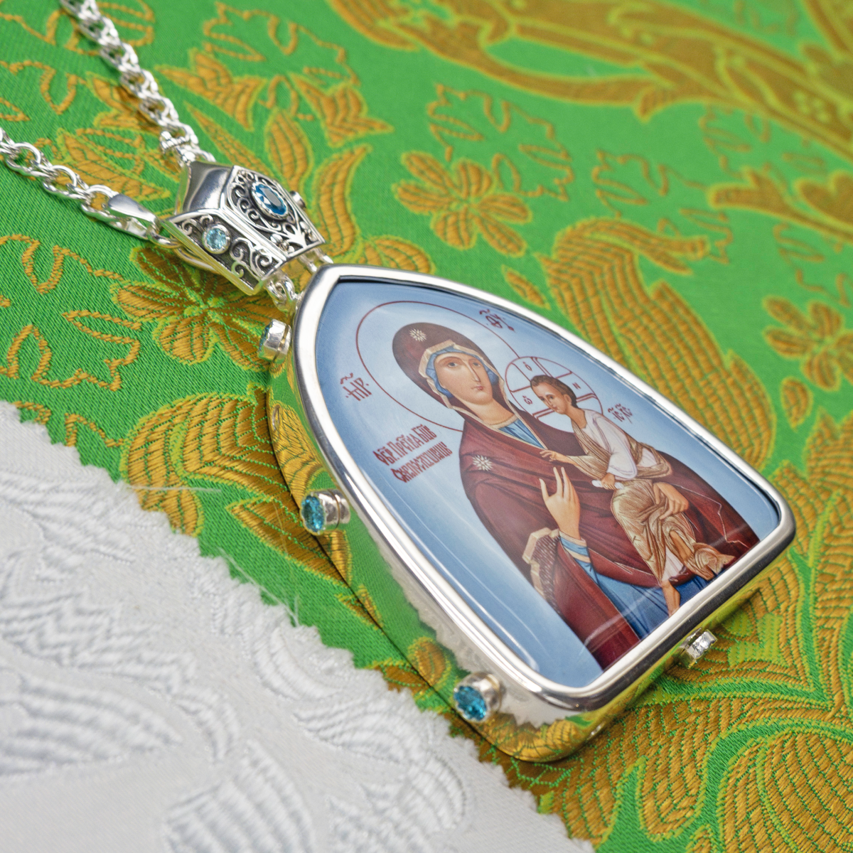 Панагия изготовлена из высококачественного ювелирного сплава, покрытого серебрением гальваническим методом. Такая технология нанесения гарантирует неизменный первоначальный вид изделий на очень длительный срок и простоту в уходе. Изделие декорировано вставками из камней-фианитов голубого цвета ручной закрепки, а также акцентным патинированием короны панагии. Изделие продается в фирменной упаковке из экокожи с бархатным ложементом.