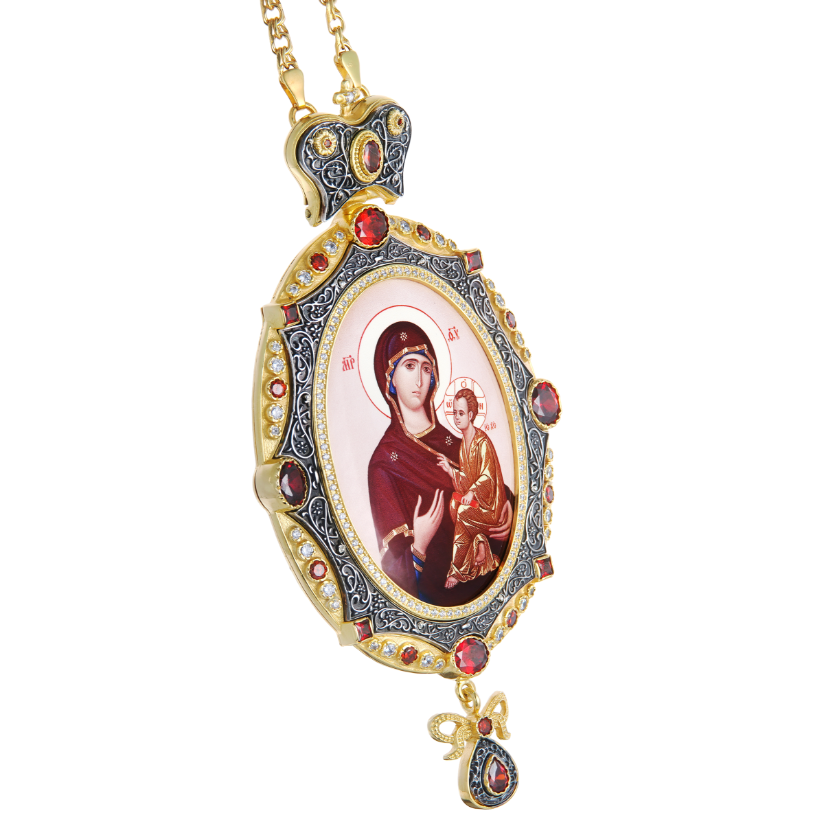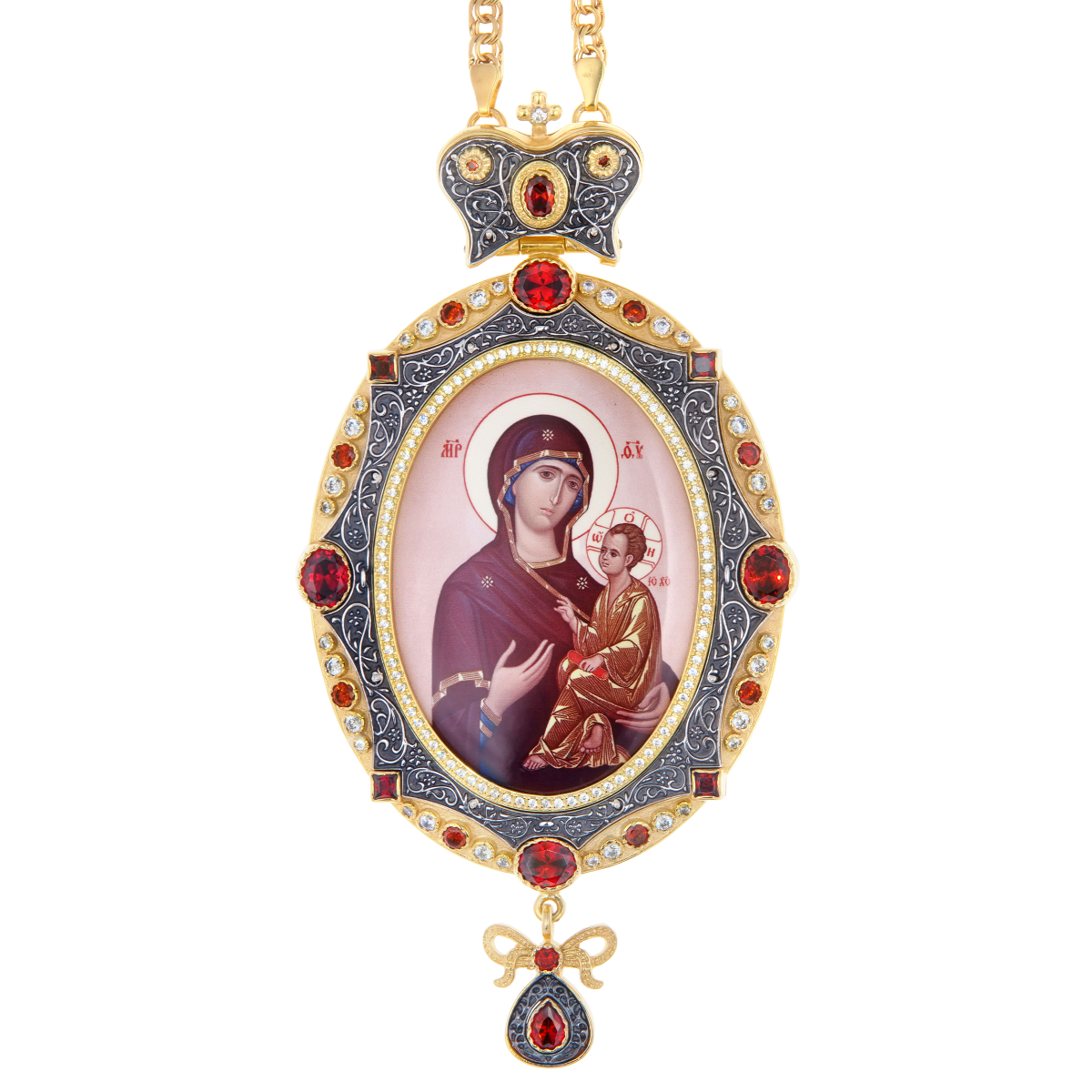 Панагия изготовлена из высококачественного ювелирного сплава, позолочена и посеребрена гальваническим методом. Такое покрытие продлевает срок службы изделий, защищает от внешних неблагоприятных воздействий. Изделие декорировано вставками из фианитов красного цвета ручной закрепки и патинированием. Образ Богородицы изготовлен с помощью специальной технологии нанесения изображения на латунную основу и покрыт защитным составом, предохраняющим от выгорания цвета и различных повреждений. По вашему заказу Образ может быть любой. Изделие продаётся в фирменной упаковке из экокожи с бархатным ложементом.