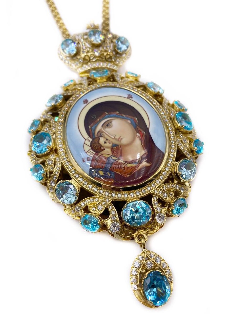 Архиерейская панагия изготовлена из высококачественного ювелирного сплава . Образ на панагии выполнен по специальной технологии нанесения цветного изображения на металлическую основу. Он покрыт защитным составом, который предохраняет его от выгорания цвета и различных повреждений. Панагия продается в презентабельной упаковке из кожвинила с бархатным ложементом.