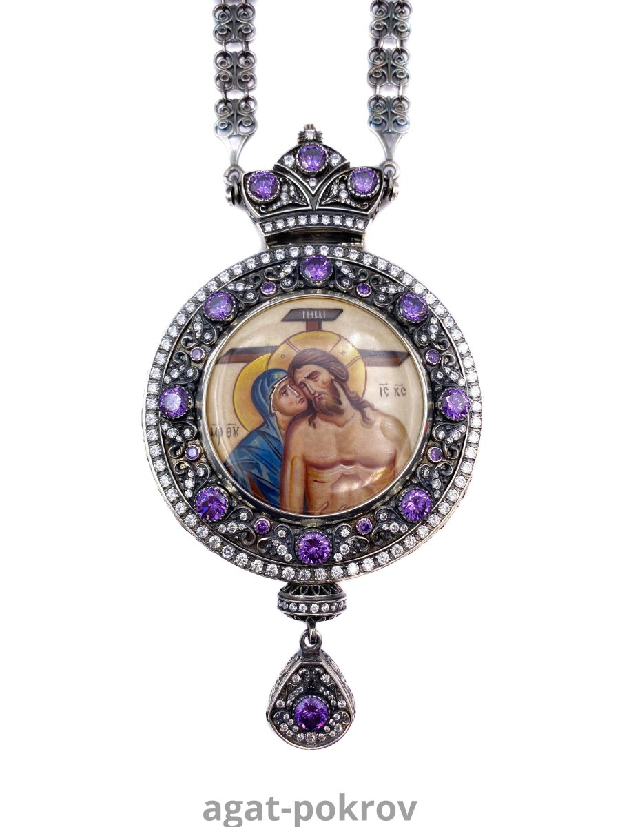 Панагия изготовлена из высококачественного ювелирного сплава, покрытого серебрением гальваническим методом, такое покрытие продлевает срок службы изделия, защищает от внешних неблагоприятных воздействий. Лик выполнен по специальной технологии нанесения цветного изображения на латунную основу. продается в фирменной упаковке из экокожи с бархатным ложементом.