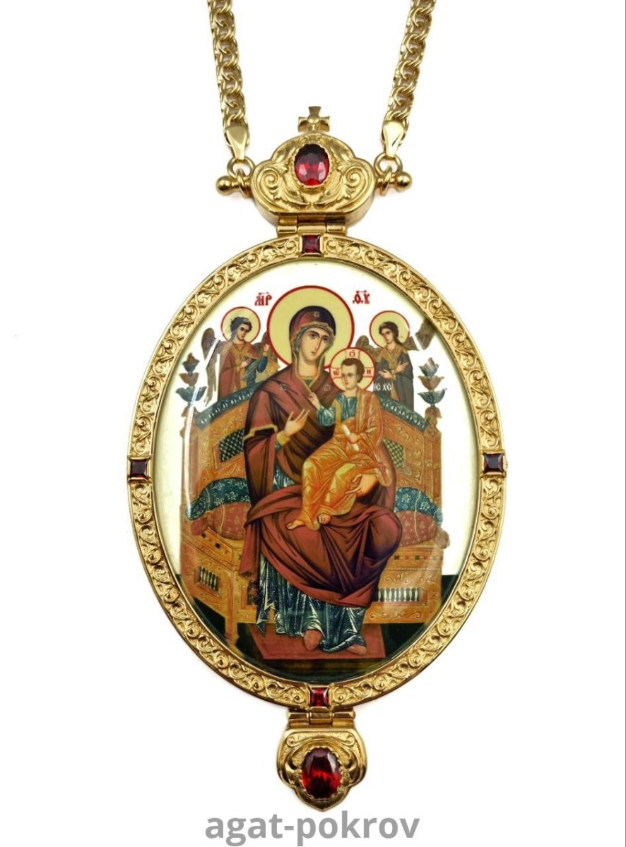 Панагия изготовлена из высококачественного ювелирного сплава, покрытого позолотой гальваническим методом. Такое покрытие продлевает срок службы изделия, защищает от внешних неблагоприятных воздействий. Образ выполнен по технологии нанесения цветного изображения на латунную основу. Панагия декорирована красными камнями. Продается в фирменной упаковке из экокожи с бархатным ложементом.