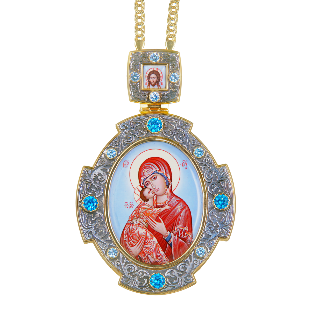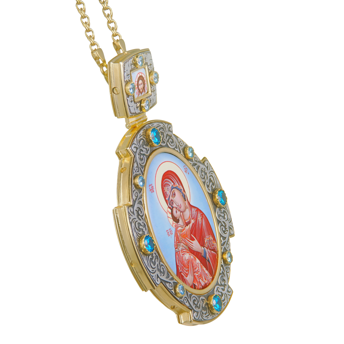 Панагия с цепью изготовлена из высококачественного ювелирного сплава, специально созданного для производства ювелирных изделий. Она покрыта качественной позолотой при помощи гальваники. Нанесенное таким способом покрытие очень надежное и долговечное, благодаря ему первоначальный вид изделия сохранится в неизменном виде на длительный срок. Панагия изготовлена исключительно при помощи ручного труда, образы выполнены при помощи специальной технологии нанесения цветного изображения на металлическую основу, оно покрыто защитным составом, предохраняющим его от выгорания цвета и повреждений.