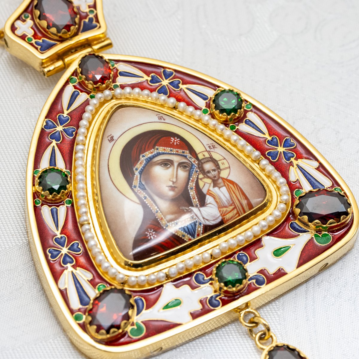 Панагия оригинального дизайна изготовлен из высококачественного ювелирного сплава. Образ выполнен при помощи специальной технологии нанесения деколь. Панагия покрыта качественной и надежной позолотой. Изделие декорировано фианитами. Продаётся в фирменной упаковке из экокожи с бархатным ложементом.