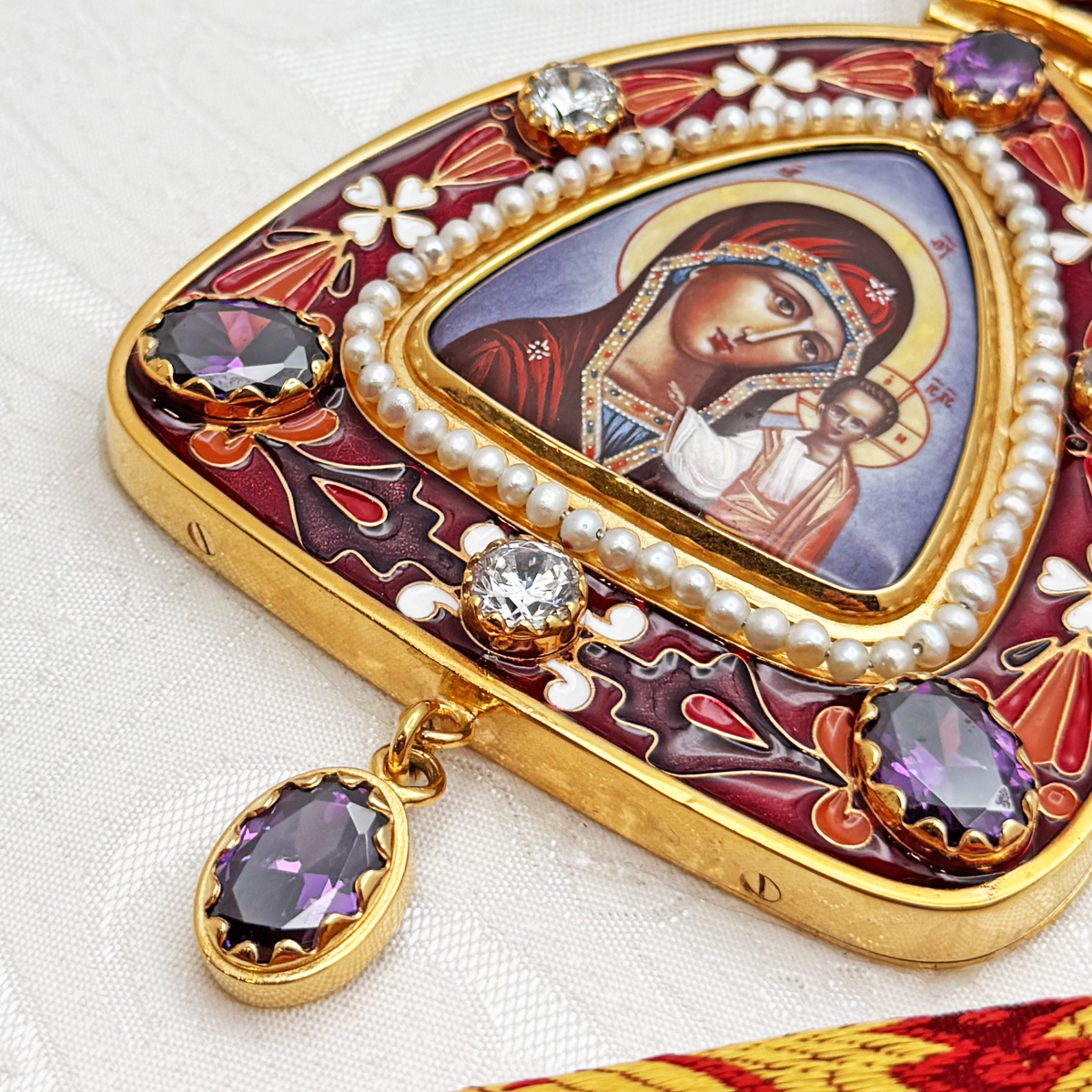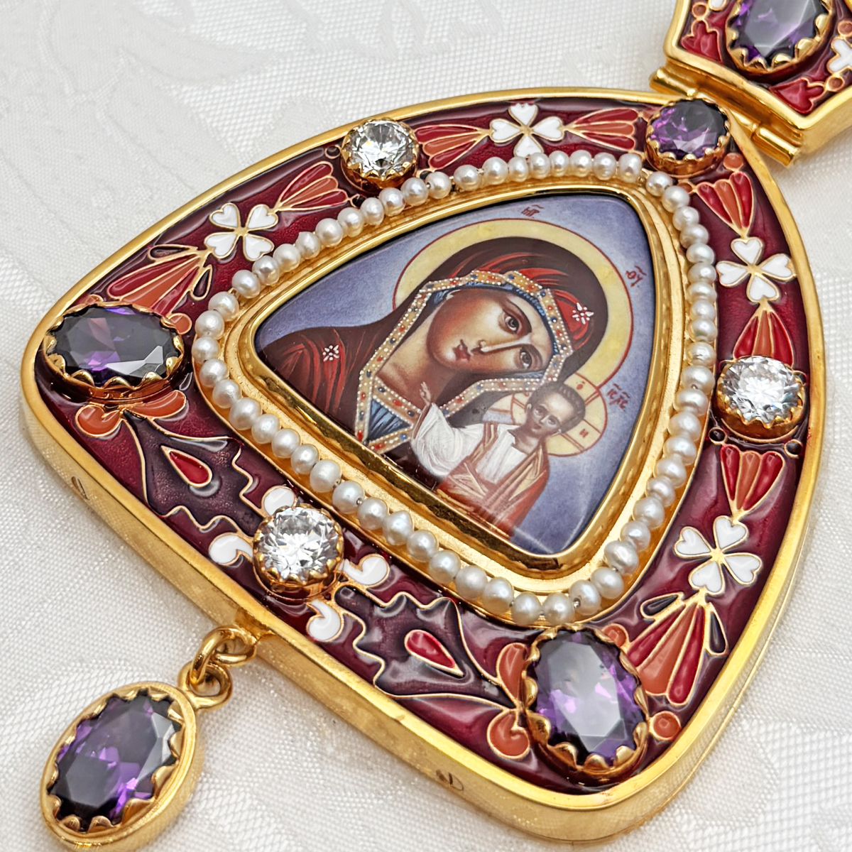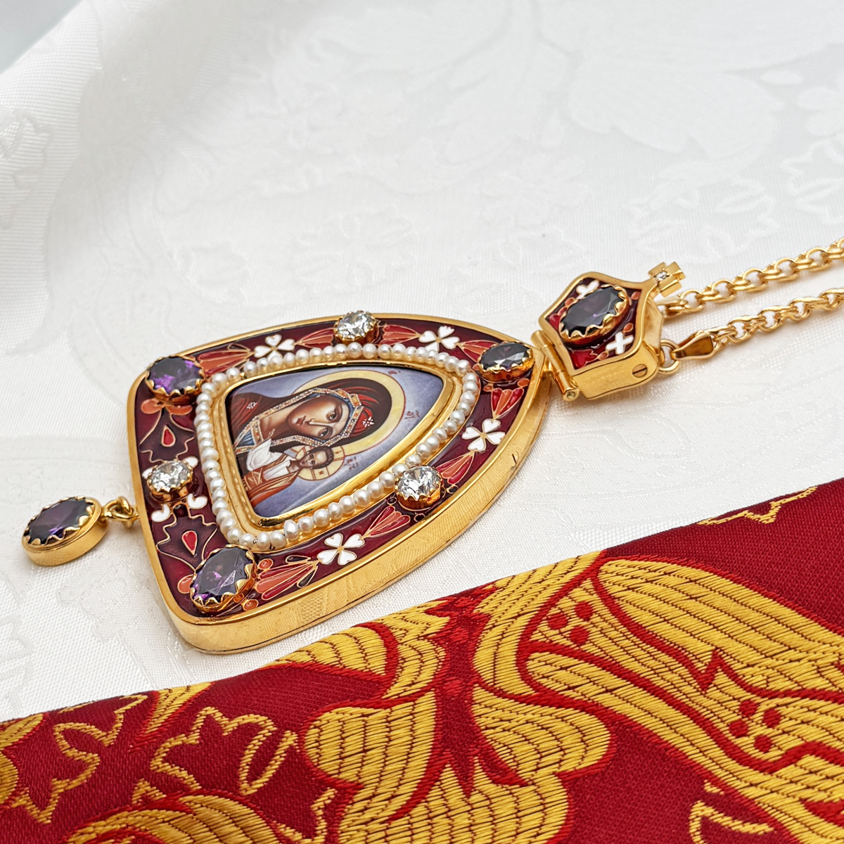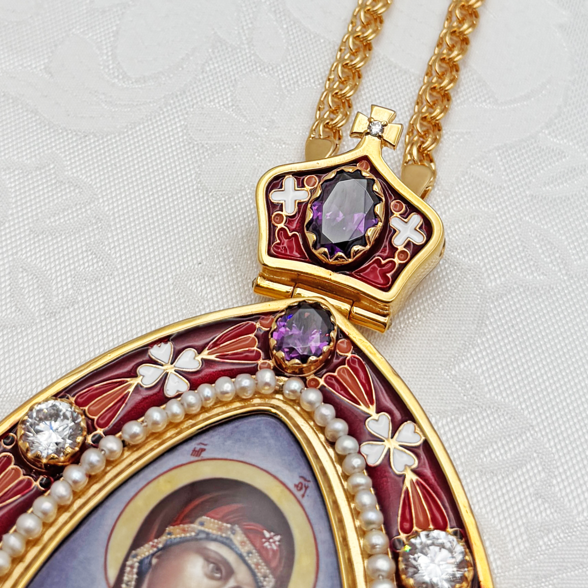 Панагия оригинального дизайна изготовлен из высококачественного ювелирного сплава. Образ выполнен при помощи специальной технологии нанесения деколь. Панагия покрыта качественной и надежной позолотой. Изделие декорировано фианитами и жемчугом. Продаётся в фирменной упаковке из экокожи с бархатным ложементом.