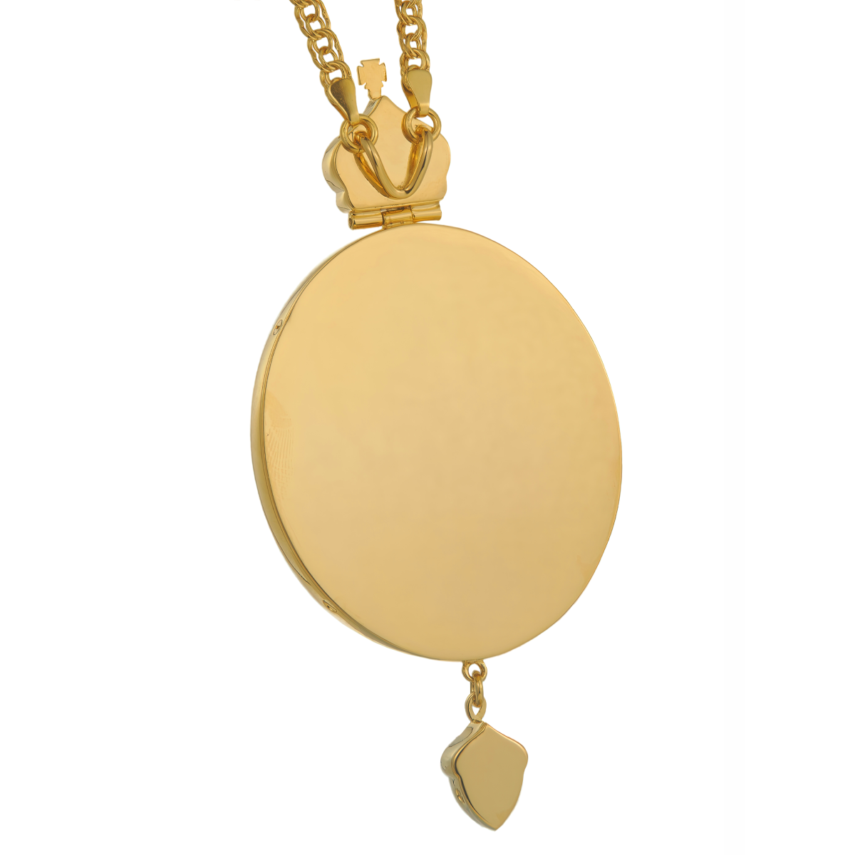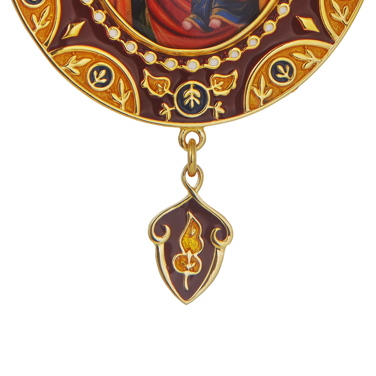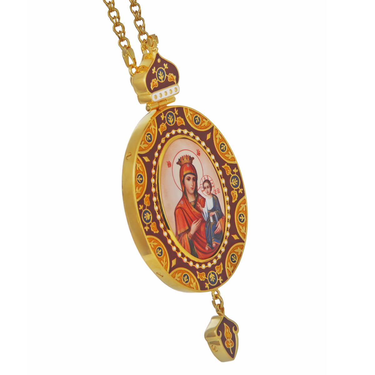 Панагия с цепью изготовлена из высококачественного ювелирного сплава, специально созданного для производства ювелирных изделий. Она покрыта качественной позолотой при помощи гальваники. Нанесенное таким способом покрытие очень надежное и долговечное, благодаря ему первоначальный вид изделия сохранится в неизменном виде на длительный срок. Панагия изготовлена исключительно при помощи ручного труда, образы выполнены при помощи специальной технологии нанесения цветного изображения на металлическую основу, оно покрыто защитным составом, предохраняющим его от выгорания цвета и повреждений. Лицевая его сторона богато декорирована эмалью.
