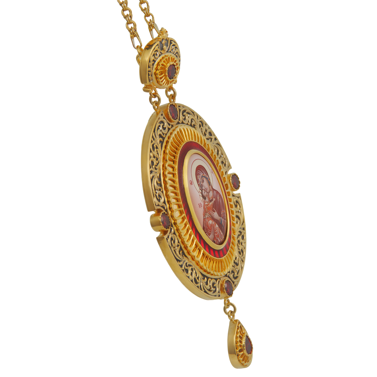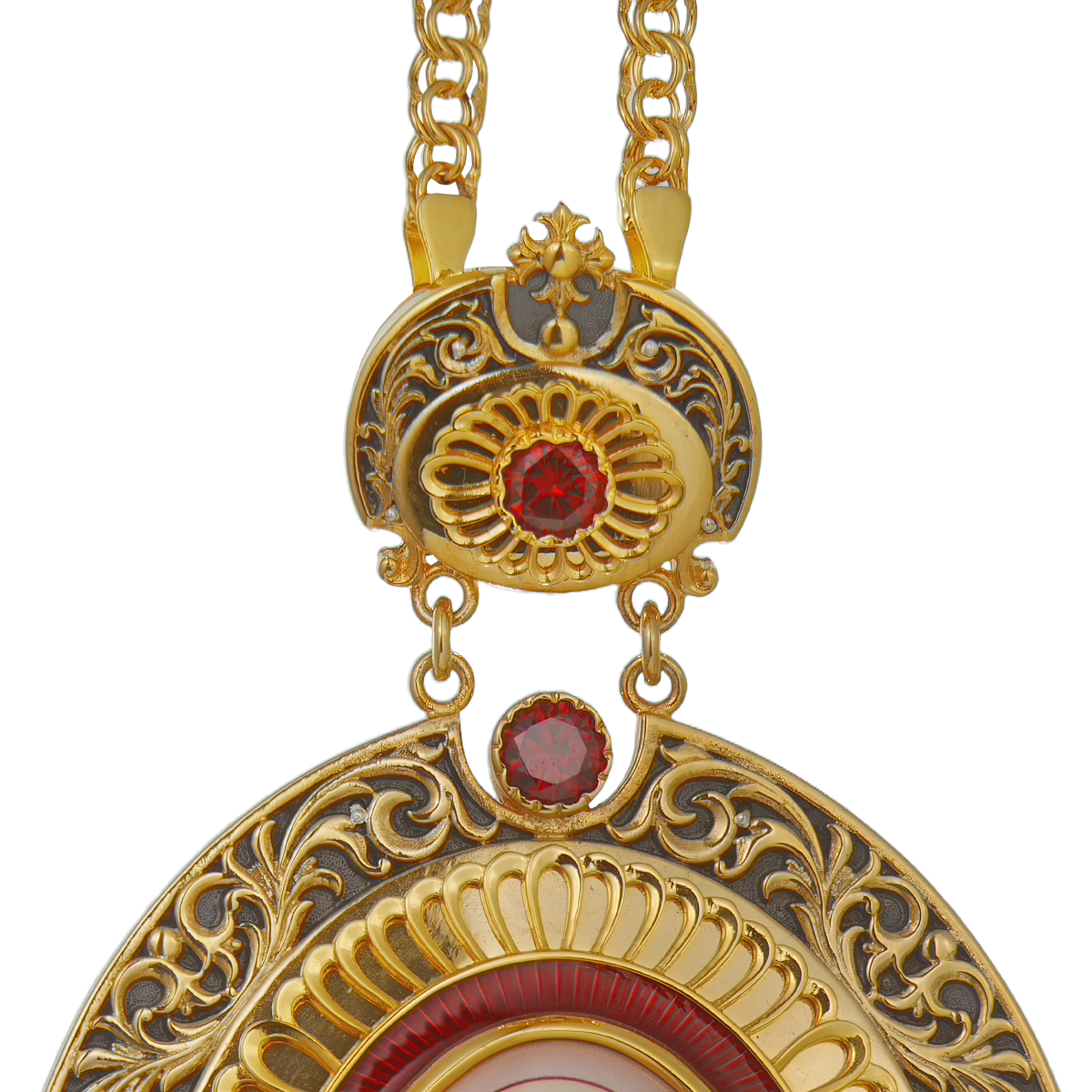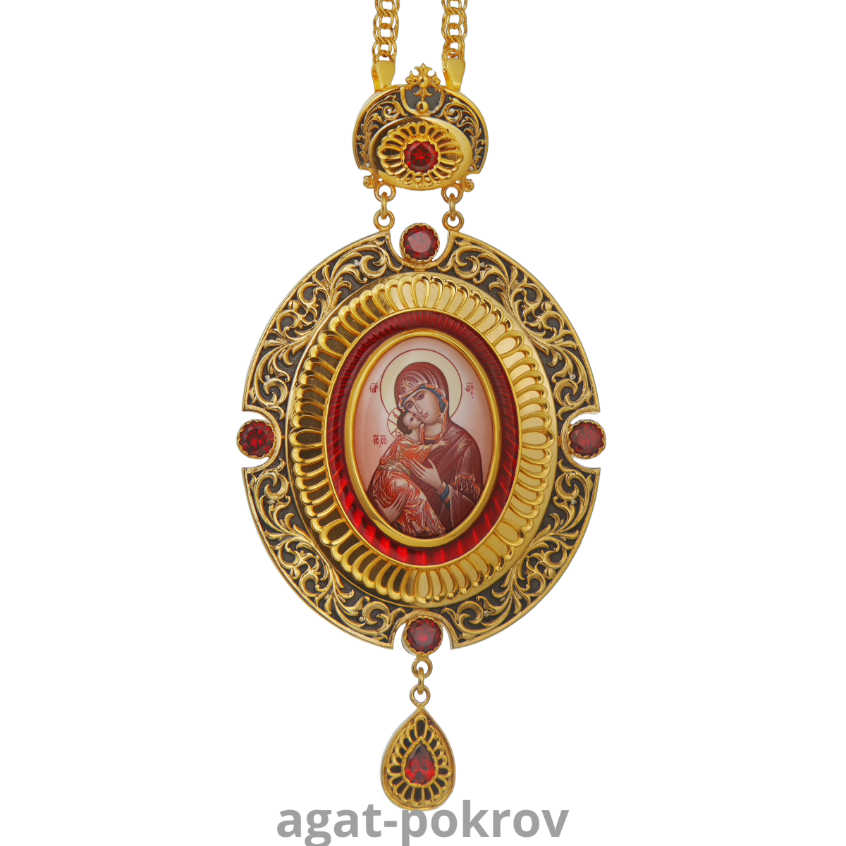 Панагия с цепью изготовлена из высококачественного ювелирного сплава, специально созданного для производства ювелирных изделий. Она покрыта качественной позолотой при помощи гальваники. Нанесенное таким способом покрытие очень надежное и долговечное, благодаря ему первоначальный вид изделия сохранится в неизменном виде на длительный срок. Панагия изготовлена исключительно при помощи ручного труда, образы выполнены при помощи специальной технологии нанесения цветного изображения на металлическую основу, оно покрыто защитным составом, предохраняющим его от выгорания цвета и повреждений. Лицевая его сторона богато декорирована разными вставками: качественными камнями фианитами закреплённых вручную, эмалью и патинированием.