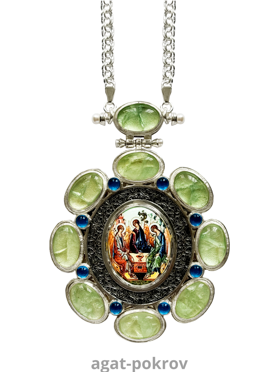 Панагия изготовлена из высококачественного ювелирного сплава, покрытого серебрением гальваническим методом. Декорирована натуральными камнями. Продается в фирменной упаковке из экокожи с бархатным ложементом.