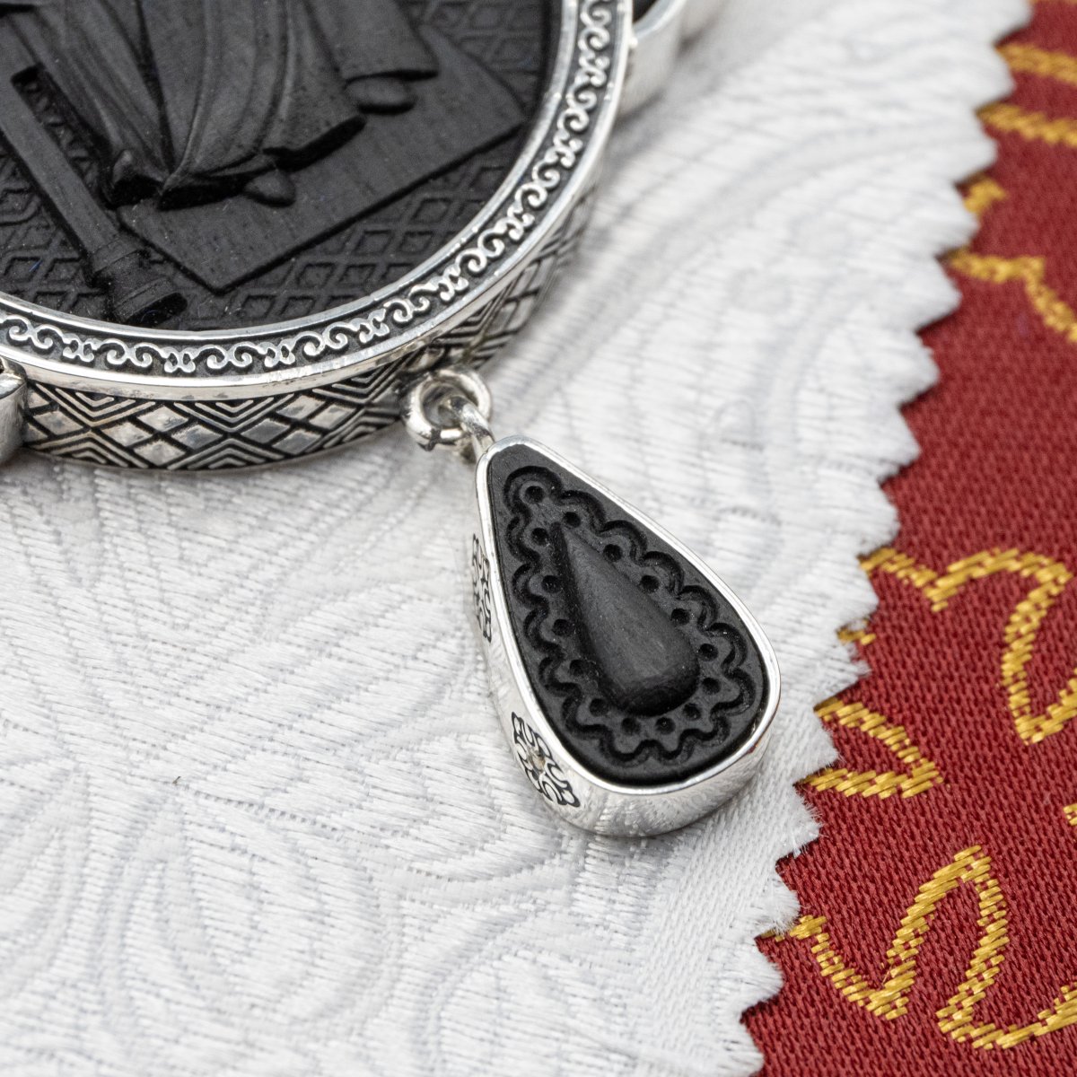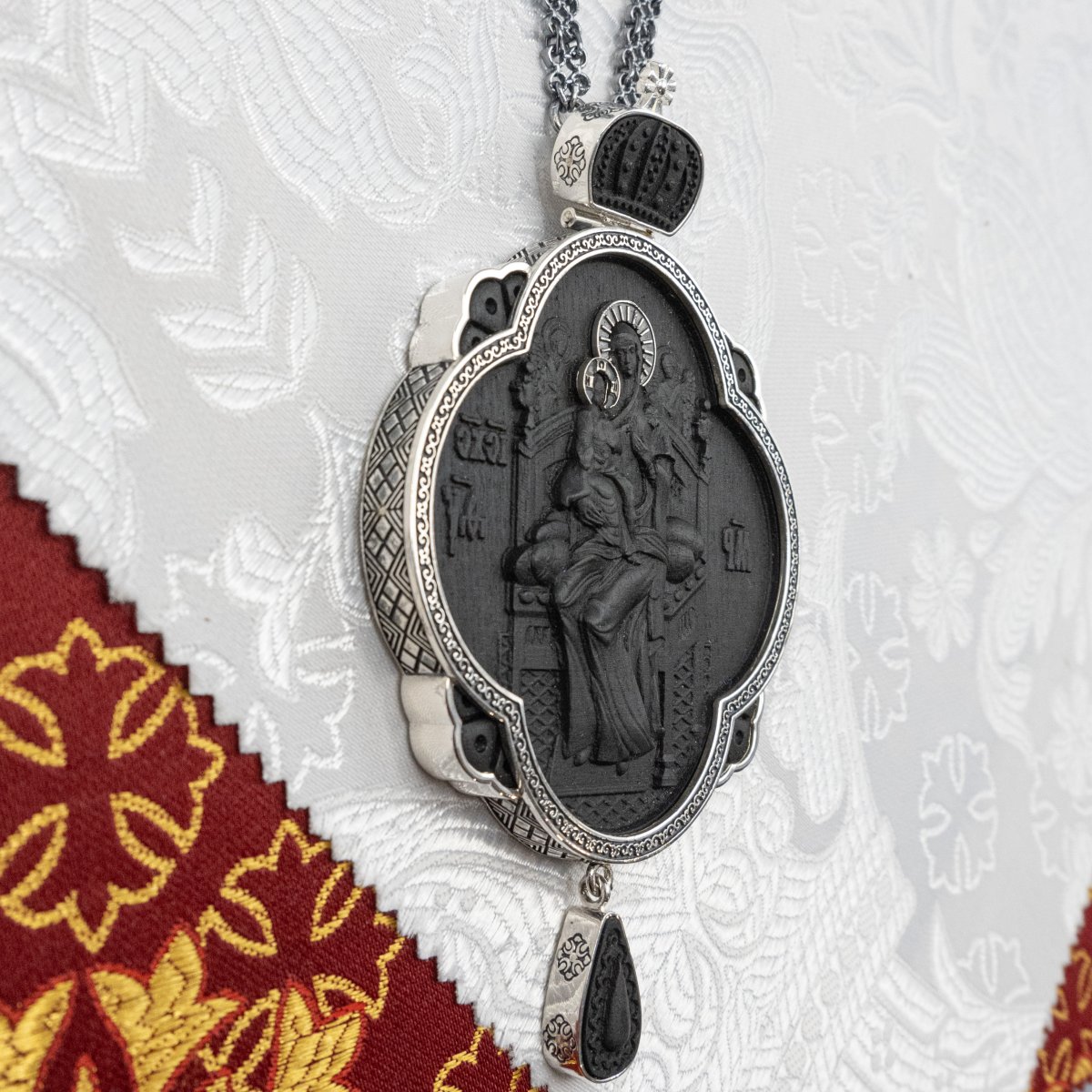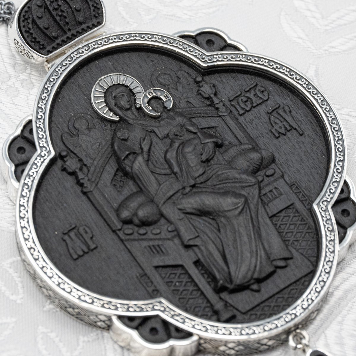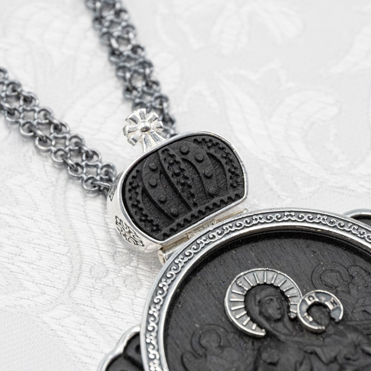 Панагия с цепью изготовлена из высококачественного ювелирного сплава, специально созданного для производства ювелирных изделий. Она покрыта качественным серебрением при помощи гальваники. Нанесенное таким способом покрытие очень надежное и долговечное, благодаря ему первоначальный вид изделия сохранится в неизменном виде на длительный срок. Панагия изготовлена исключительно при помощи ручного труда,и декорирована вставкой из дерева. Образ выполнен при помощи специальной технологии нанесения цветного изображения на металлическую основу, оно покрыто защитным составом, предохраняющим его от выгорания цвета и повреждений.