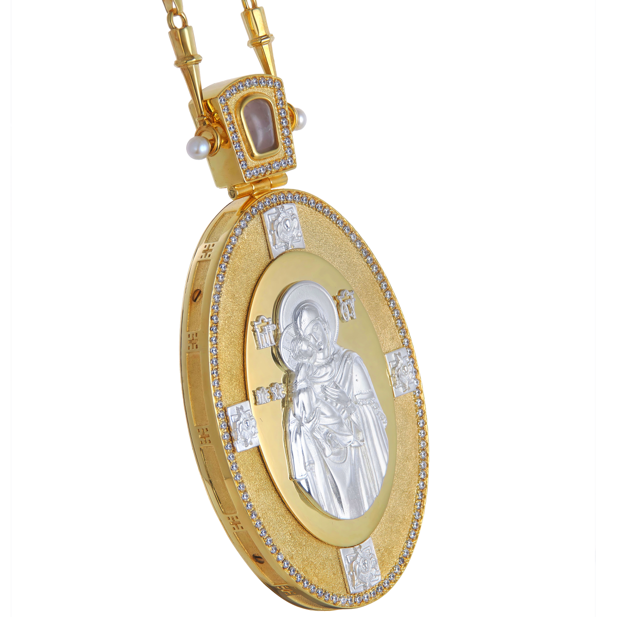 Панагия изготовлена из качественного ювелирного сплава и покрыта позолотом. Панагия сосредоточена на духовности и традициях Церкви. Данное изделие украшено жемчугом и молочным кварцем, а также литьевым образом Богоматери, акцентированным серебрением. Серебрение обеспечивает элегантный внешний вид. Панагия символизирует не только личную веру владельца, но и его преданность православной традиции. Она идеально подойдет как для повседневной ношения, так и для особых церковных торжеств.