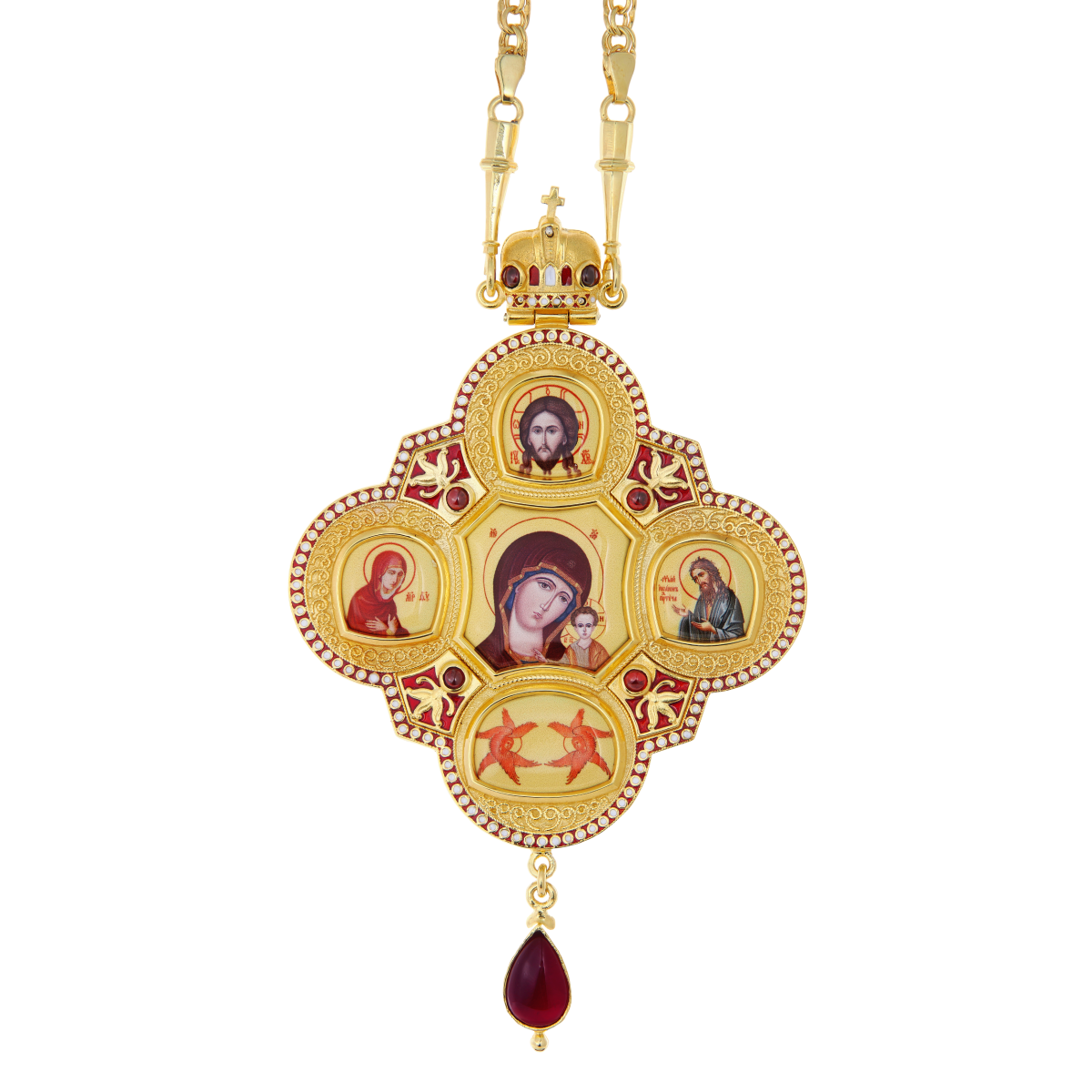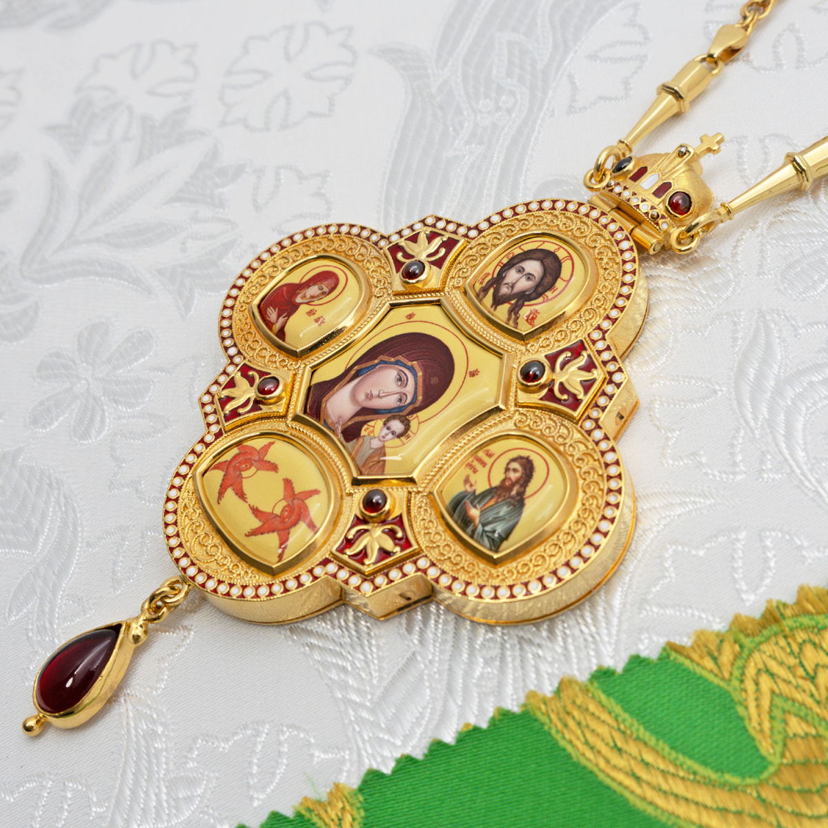 Панагия с цепью изготовлена из высококачественного ювелирного сплава, специально созданного для производства ювелирных изделий. Она покрыта позолотой при помощи гальваники. Нанесённое таким способом покрытие очень надёжное и долговечное, благодаря ему первоначальный вид изделия сохранится неизменным на длительный срок. Панагия изготовлена вручную, Образы выполнены при помощи специальной технологии нанесения цветного изображения на металлическую основу и покрыты защитным составом, предохраняющим от выгорания цвета и повреждений. Лицевая сторона панагии декорирована эмалью. Красный кварц и белые фианиты ручной закрепки дополнительно украшают изделие.