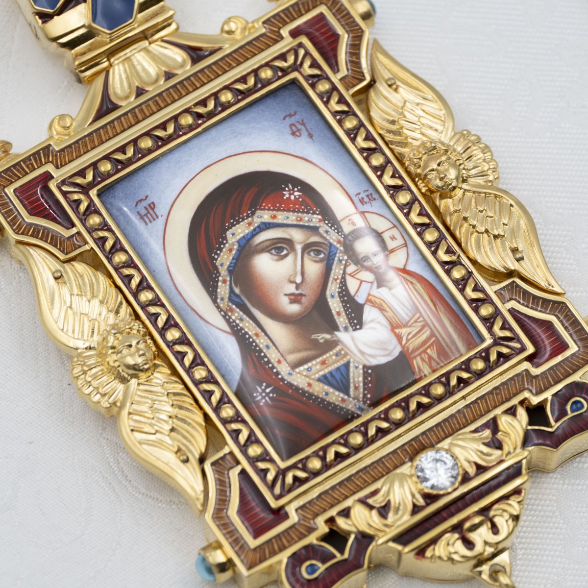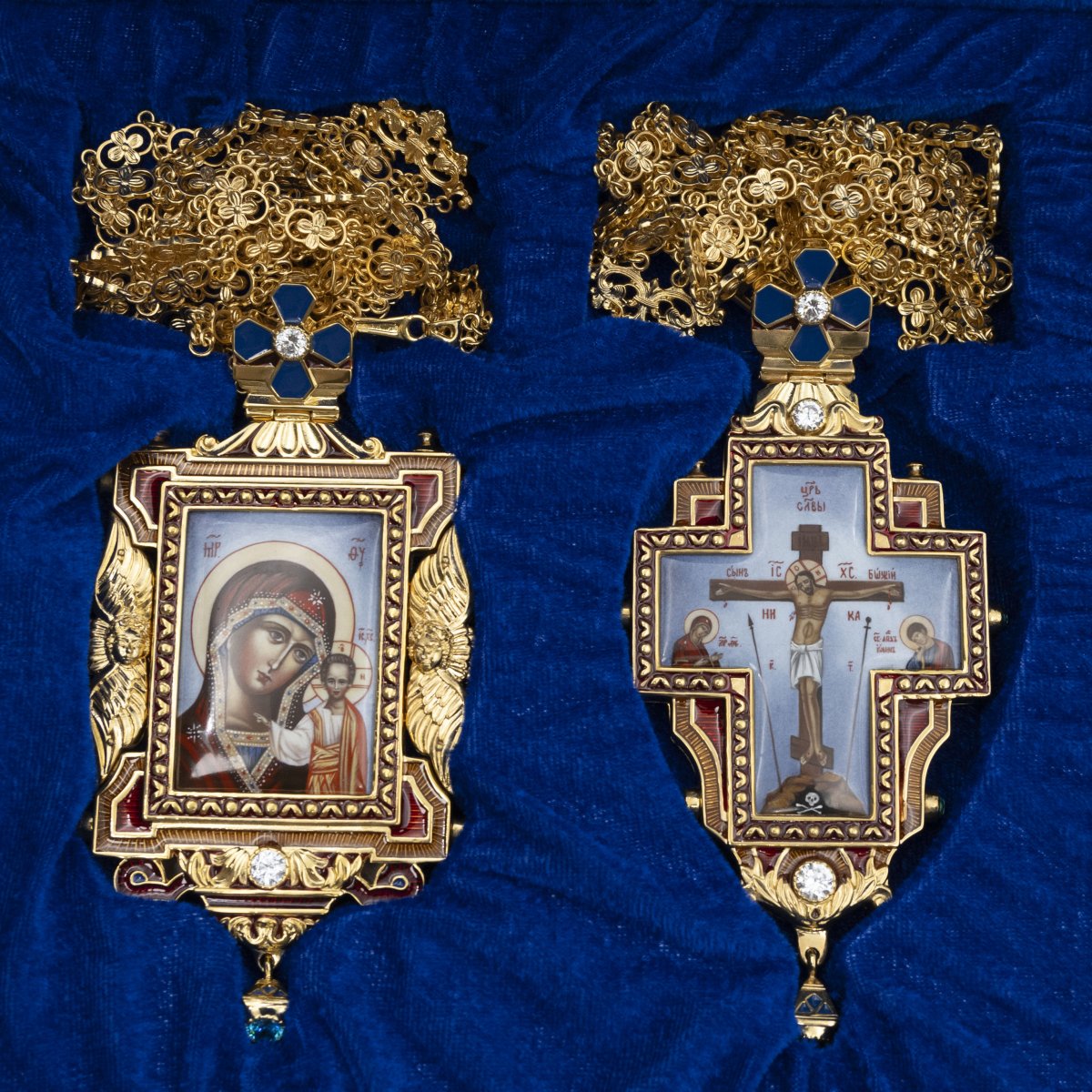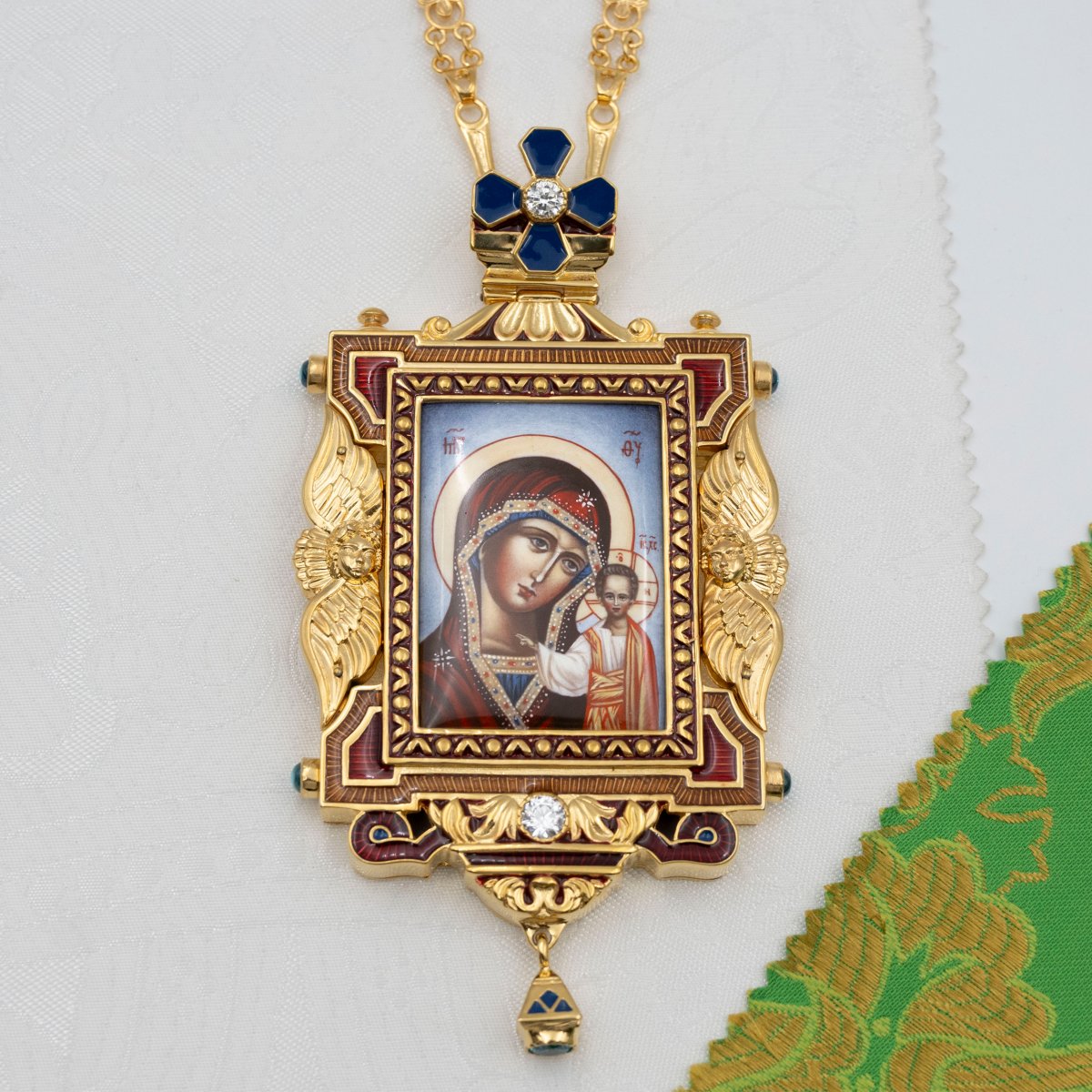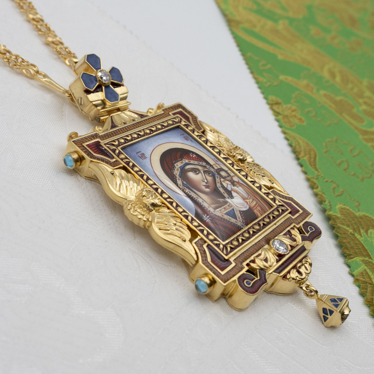 Панагия с цепью изготовлена из высококачественного ювелирного сплава, специально созданного для производства ювелирных изделий. Она покрыта качественной позолотой при помощи гальваники. Нанесенное таким способом покрытие очень надежное и долговечное, благодаря ему первоначальный вид изделия сохранится в неизменном виде на длительный срок. Панагия изготовлена исключительно при помощи ручного труда,и декорирована фианитами и эмалью. Образы выполнены при помощи специальной технологии нанесения цветного изображения на металлическую основу, оно покрыто защитным составом, предохраняющим его от выгорания цвета и повреждений.
